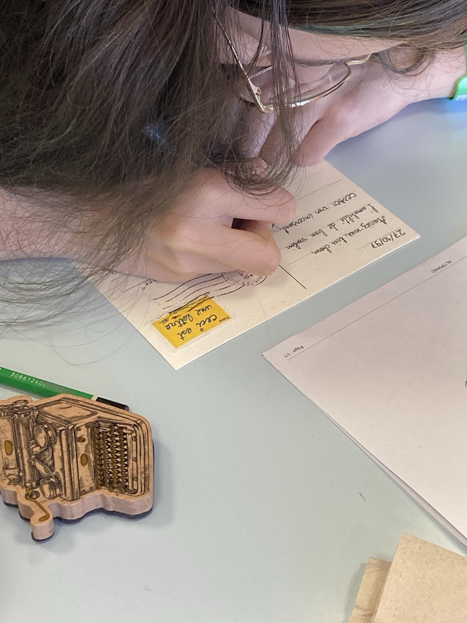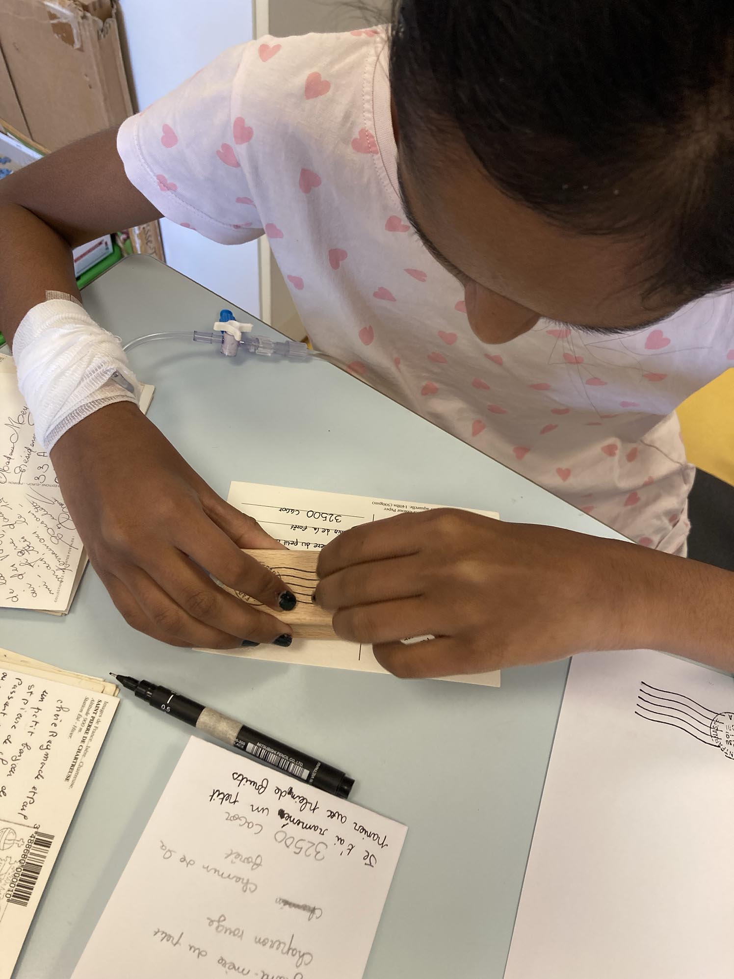 Ateliers à l'hôpital, Dessin, graphisme à l'hôpital Art postal 28 novembre 2025 Sylvie Sédillot Laisser un commentaire Share on Facebook.Share on Twitter.Partager sur LinkedInÉpingler!Jeudi 6 novembre 2025 dans le service de pneumologie-gastroentérologie à l’hôpital Femme Mère Enfant.Nouvel atelier créatif autour d’une boite de timbres, de cartes postales vierges et de tampons. Share on Facebook.Share on Twitter.Partager sur LinkedInÉpingler!