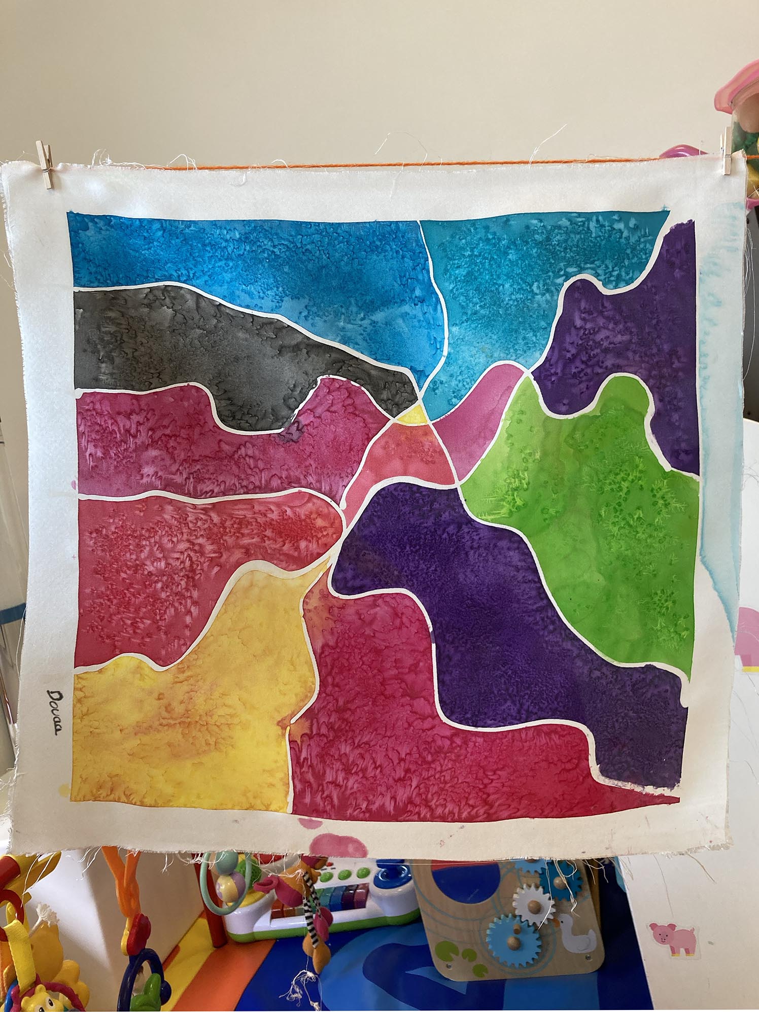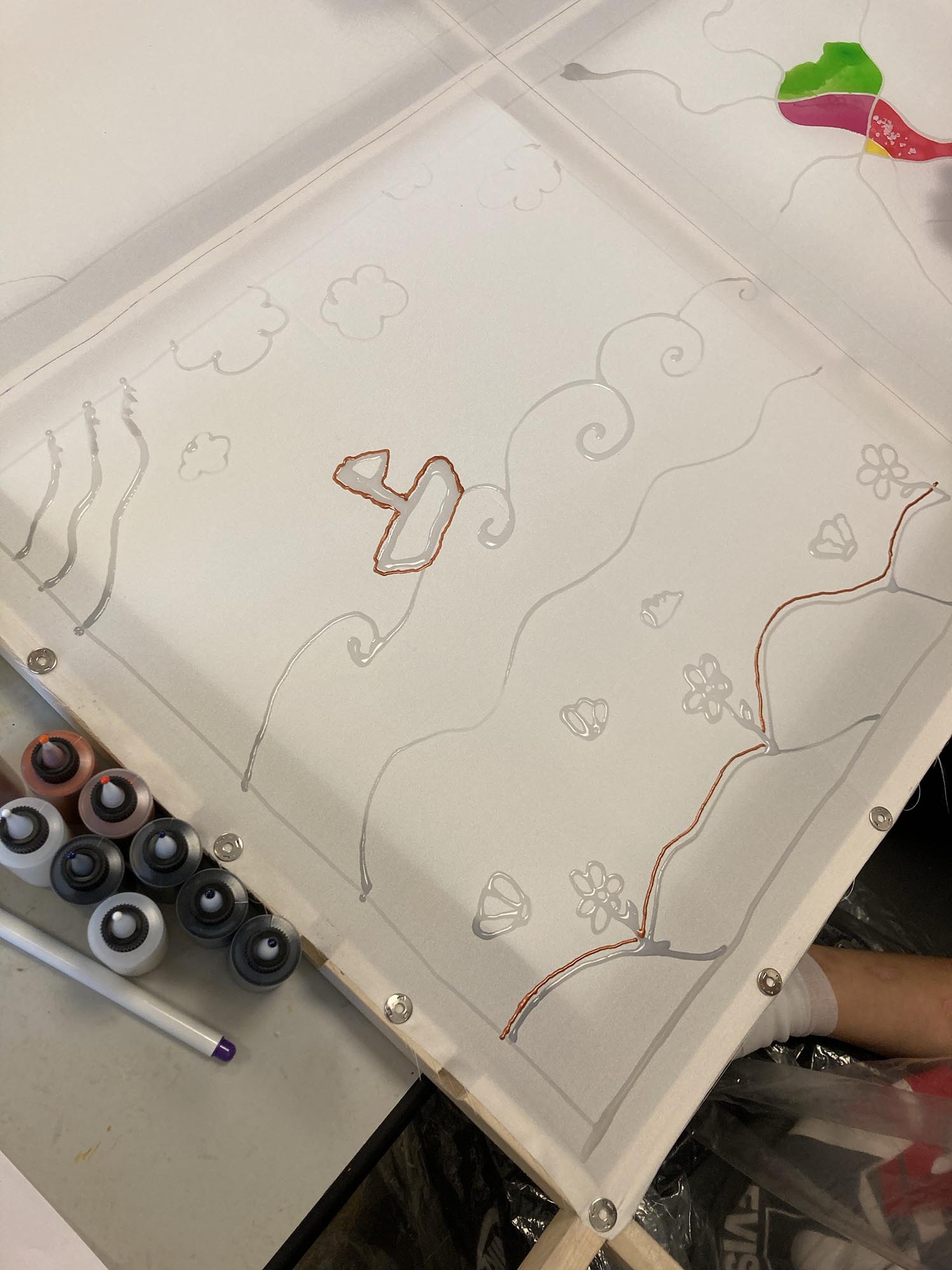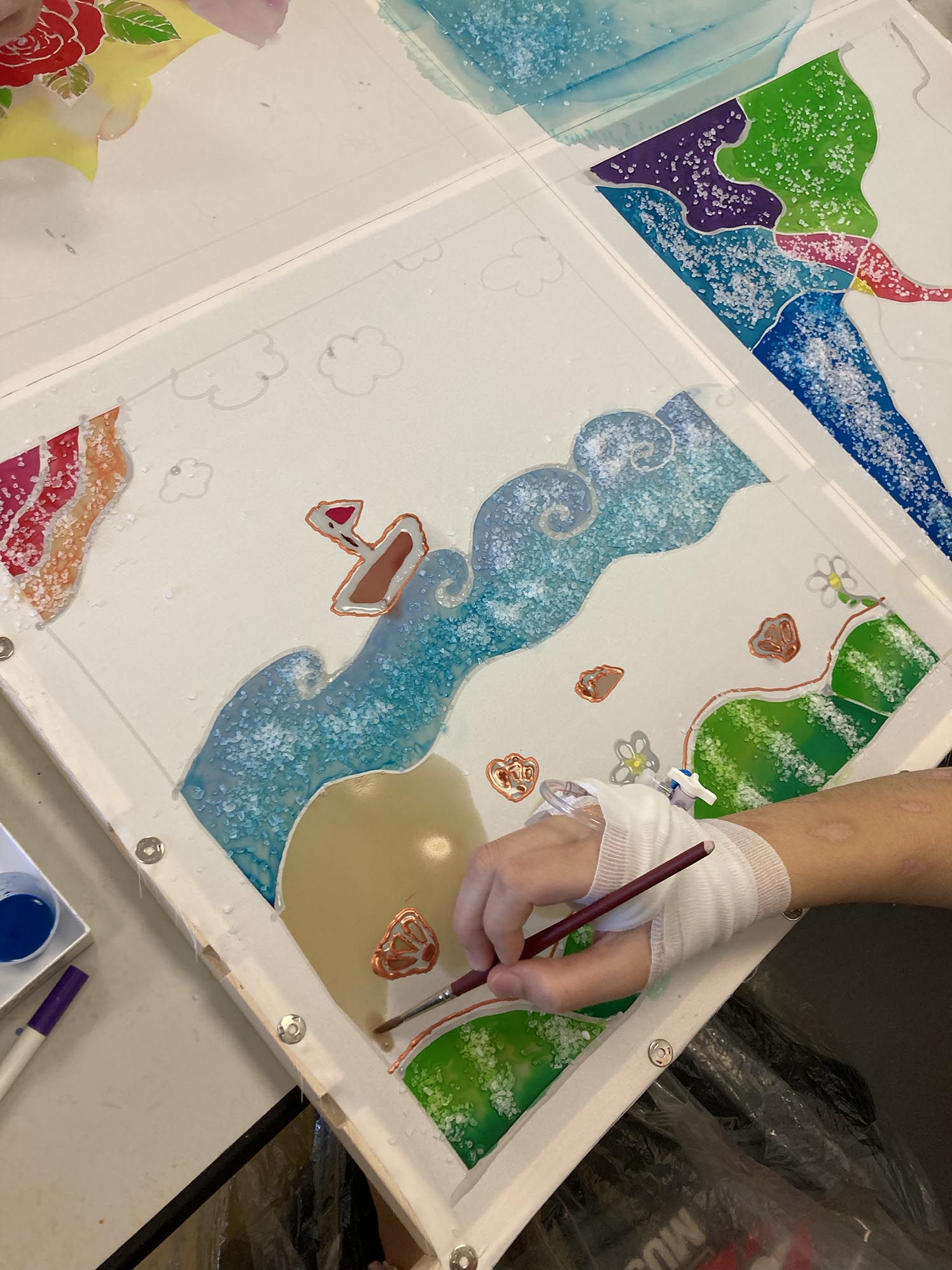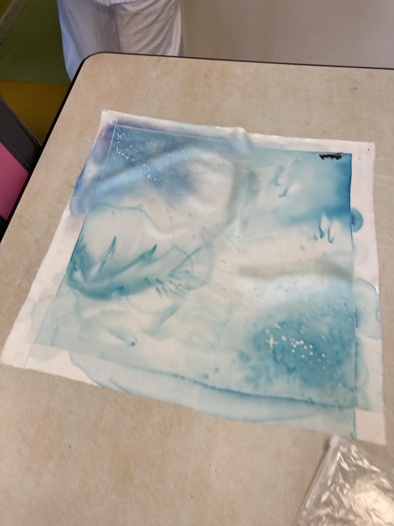 Atelier créatif avec des jeunes filles à l'hôpital Pose de la couleur entre les sertis Dessin avec des sertis avec de la Gutta Dessiner avec des sertis à la gutta Peindre entre les traits en serti Gutta Dilution de la peinture à l'eau Jeux de nuances avec de l'eau Artiste intervenant en milieu hospitalier Création d'un paysage maritime en peinture sur soie Quatre tableaux sur un même cadre Fixation de la peinture avec un fer à repasser La soie a été repassées La carré de soie de Camille La carré de soie de Mélissa La carré de soie d'Anastasia La carré de soie de Douaa
