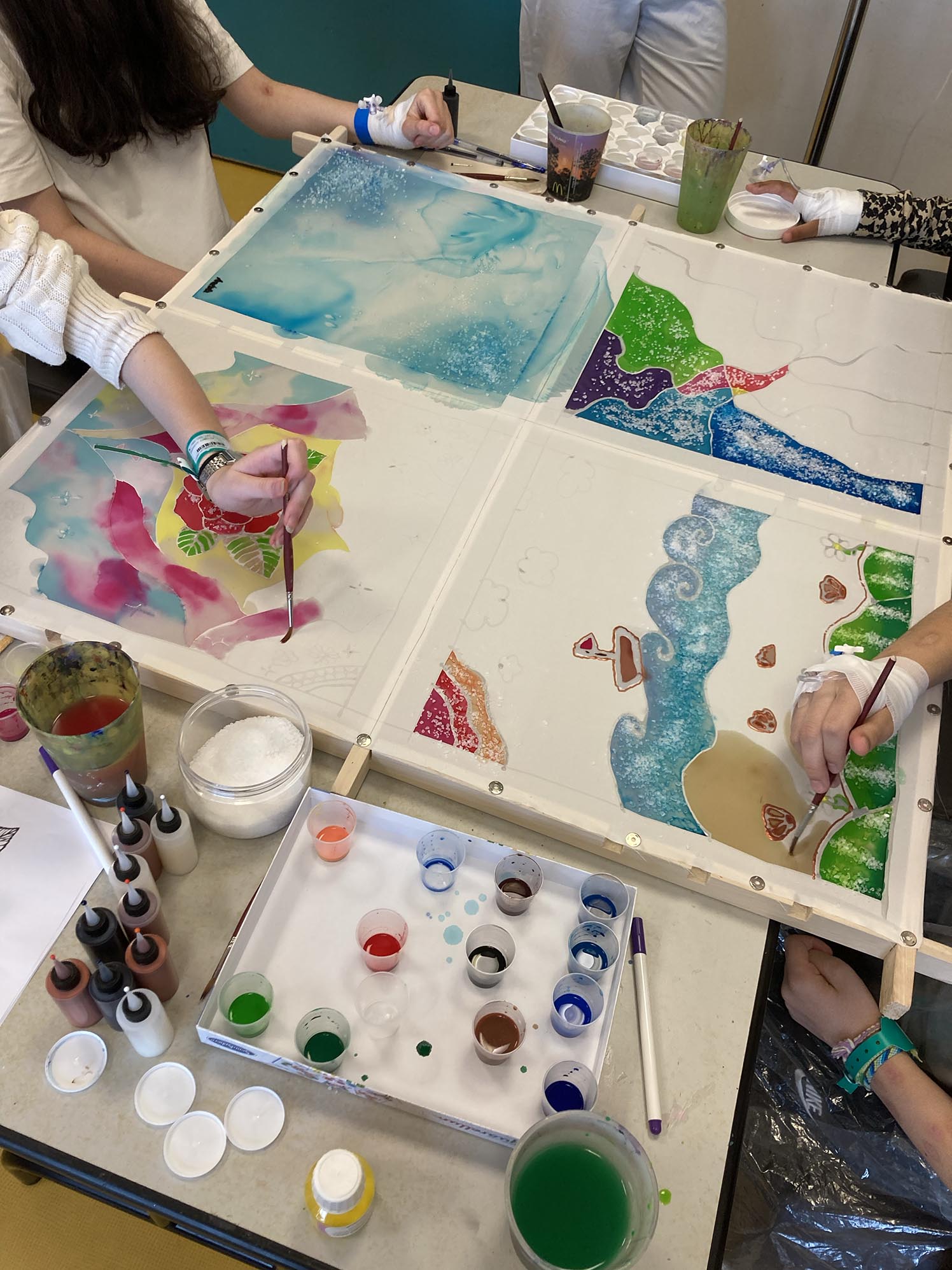 Mardi 23 septembre 2025 : Premier atelier de peinture sur soie avec Anastasia 16 ans, Camille 14 ans, Mélissa 14 aux et Douaa 15 ans, hospitalisées dans le service de néphrologie à l’hôpital HFME à Bron.