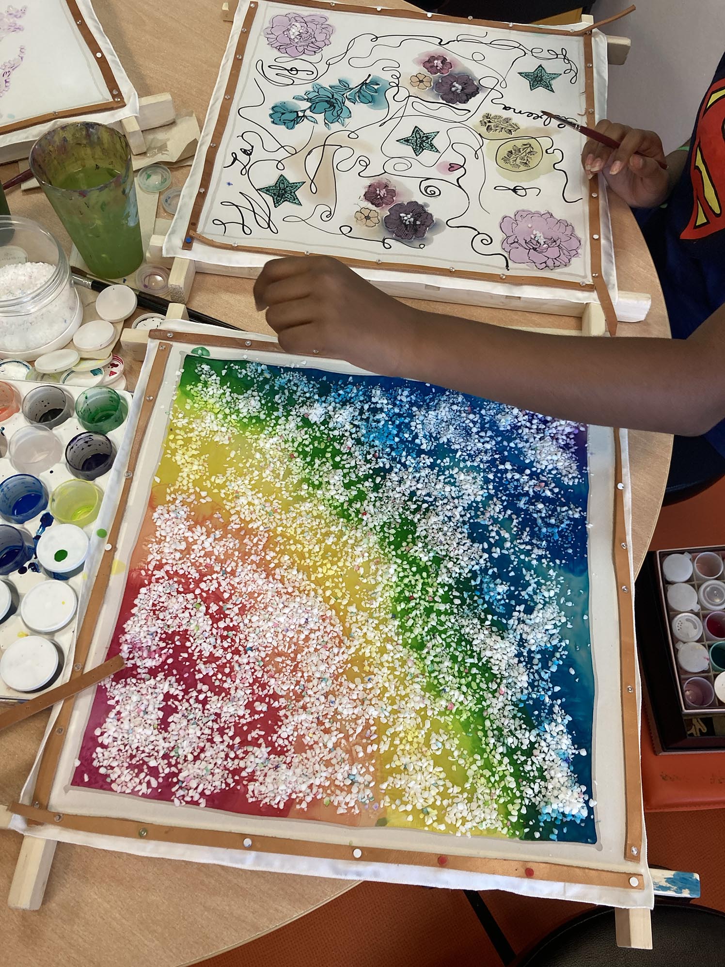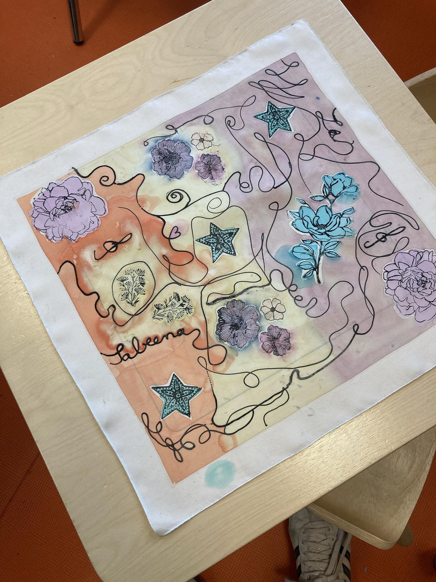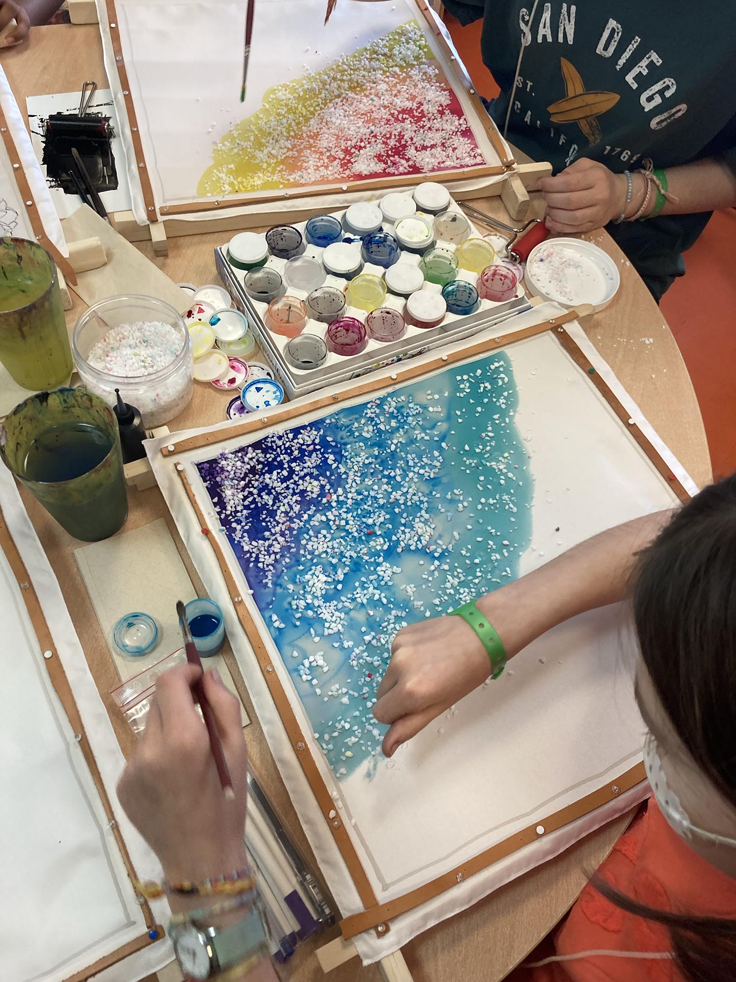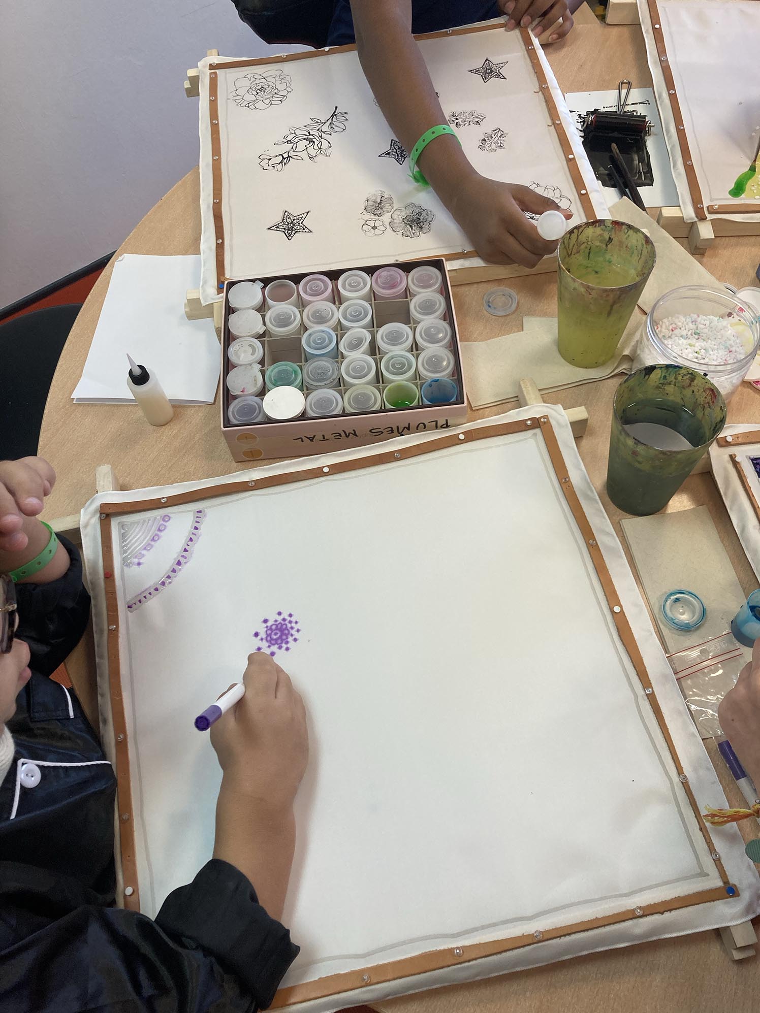 Jeudi 9 octobre 2025 dans le service des maladies du métabolisme à l’hôpital HFME. Nouvel atelier peinture sur soie auquel participent Inès 12 ans, Alice 10 ans, Sabeena 10 ans et Maya 13 ans.