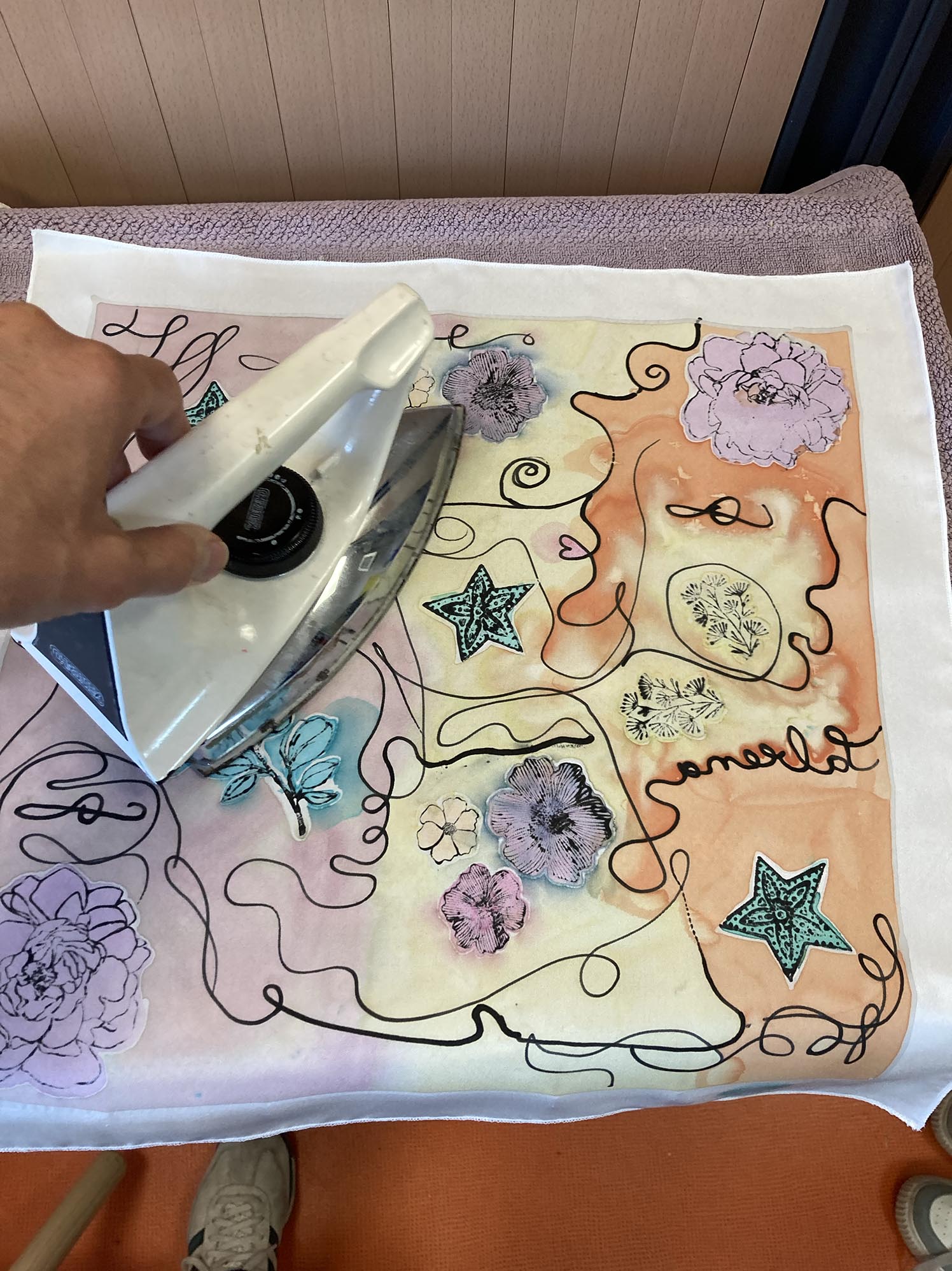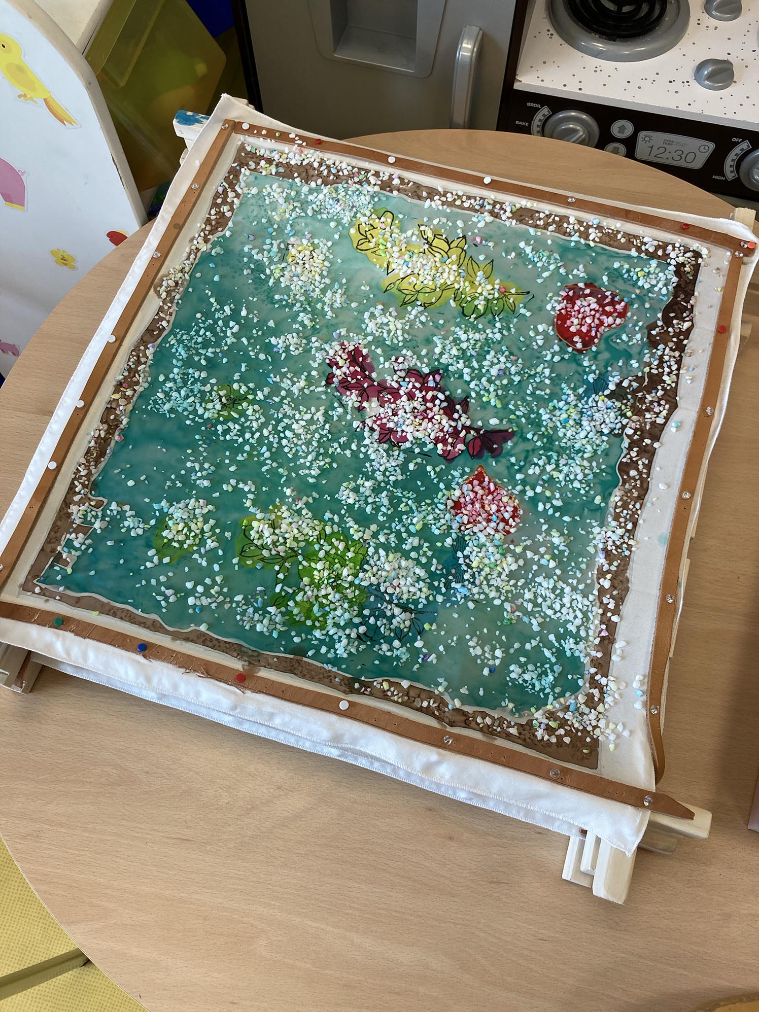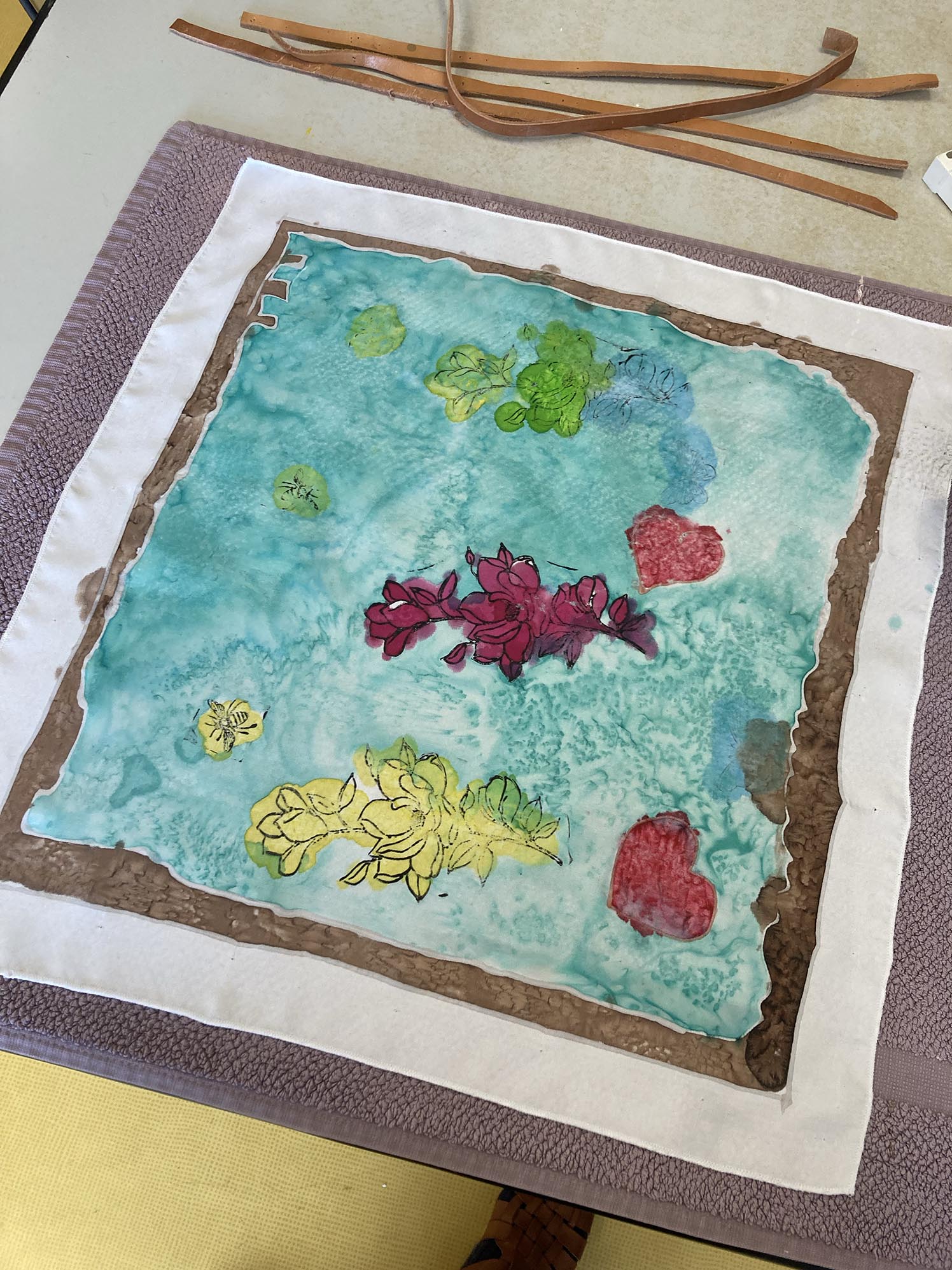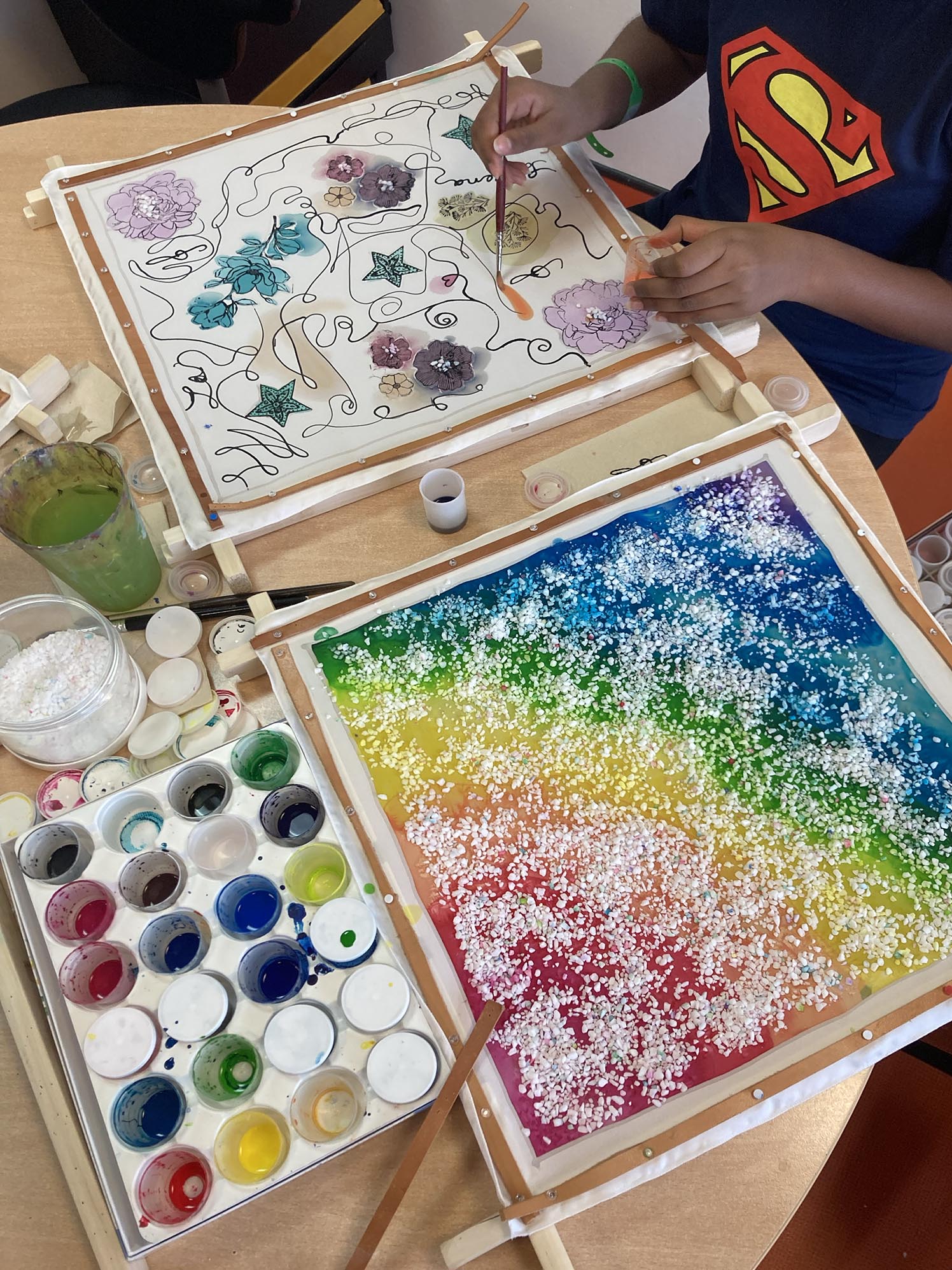Jeudi 9 octobre 2025 dans le service des maladies du métabolisme à l’hôpital HFME. Nouvel atelier peinture sur soie auquel participent Inès 12 ans, Alice 10 ans, Sabeena 10 ans et Maya 13 ans.