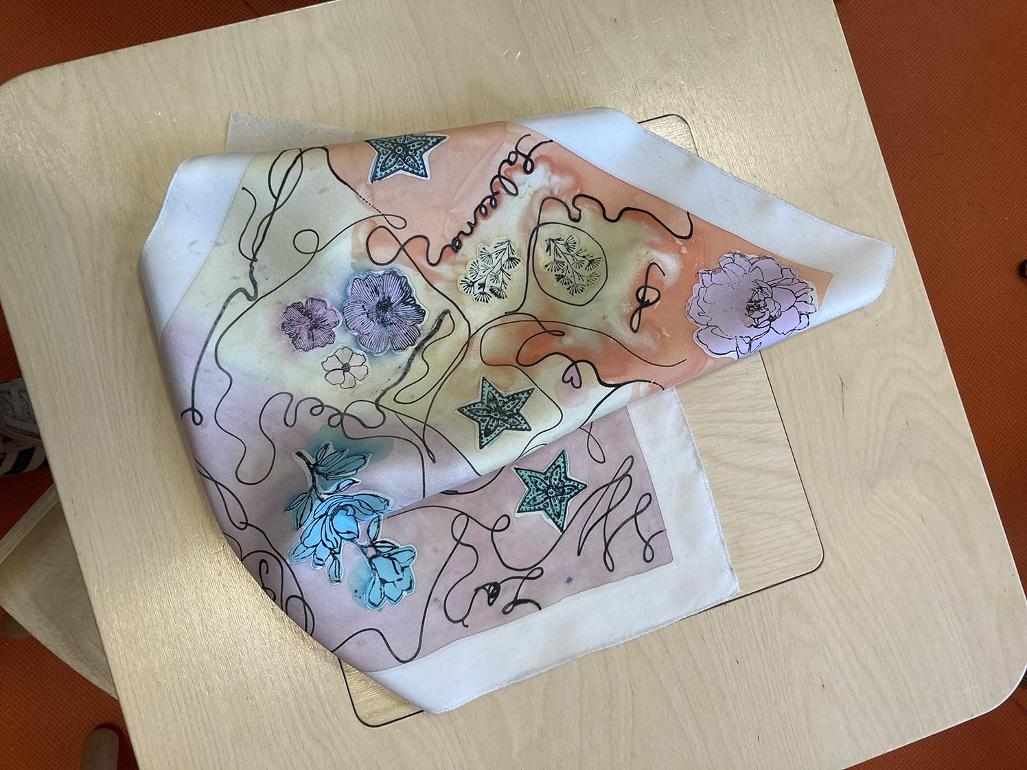 Mardi 14 octobre 2025 dans le service de néphrologie à l’hôpital HFME. Coumba 14 ans, Kamelia 17 ans, Maïssane 16 ans, Arwa 16 ans et Mila 12 ans participent à un atelier de peinture sur soie et repartent avec leur foulard dès la fin de l’atelier.