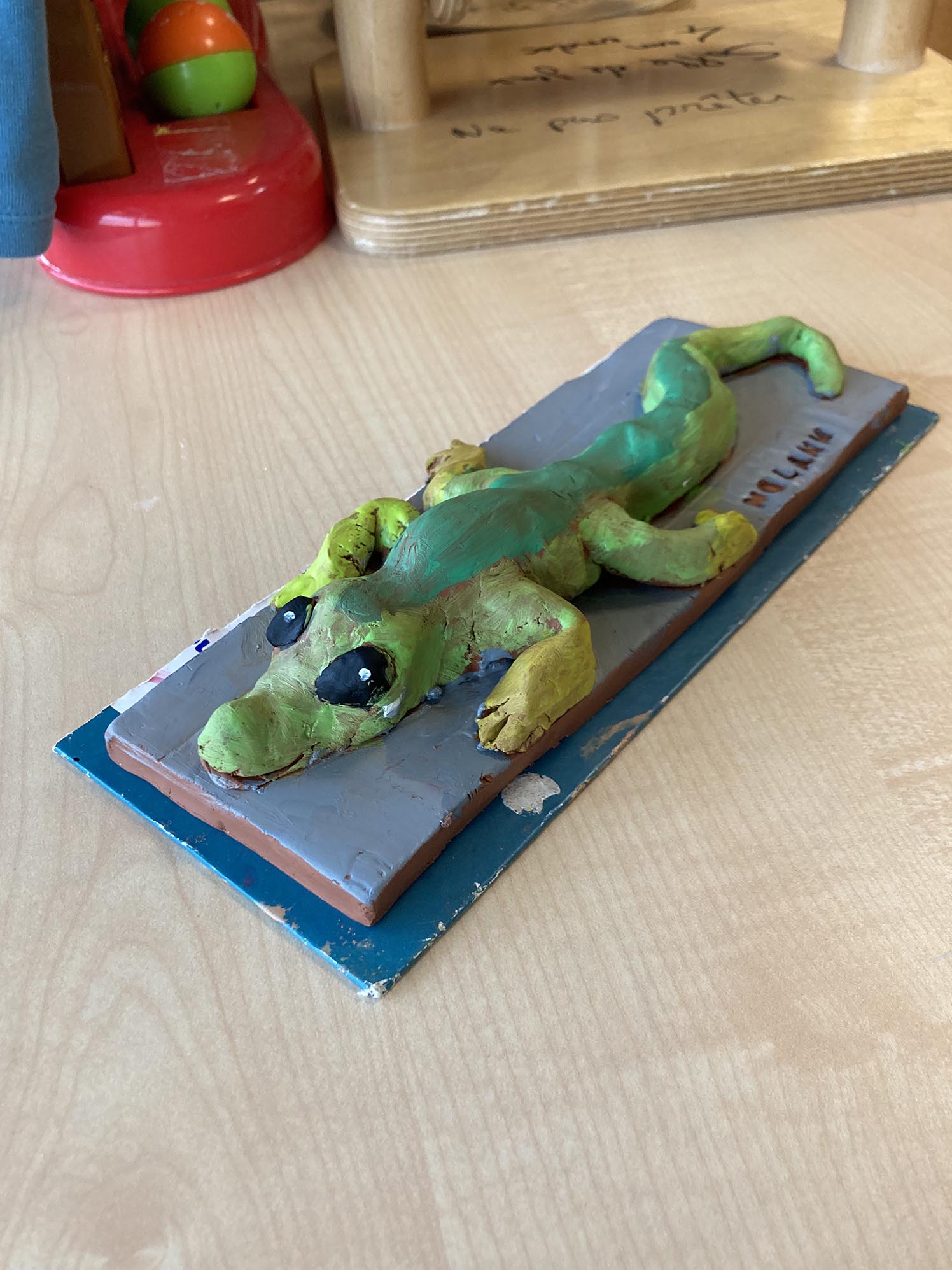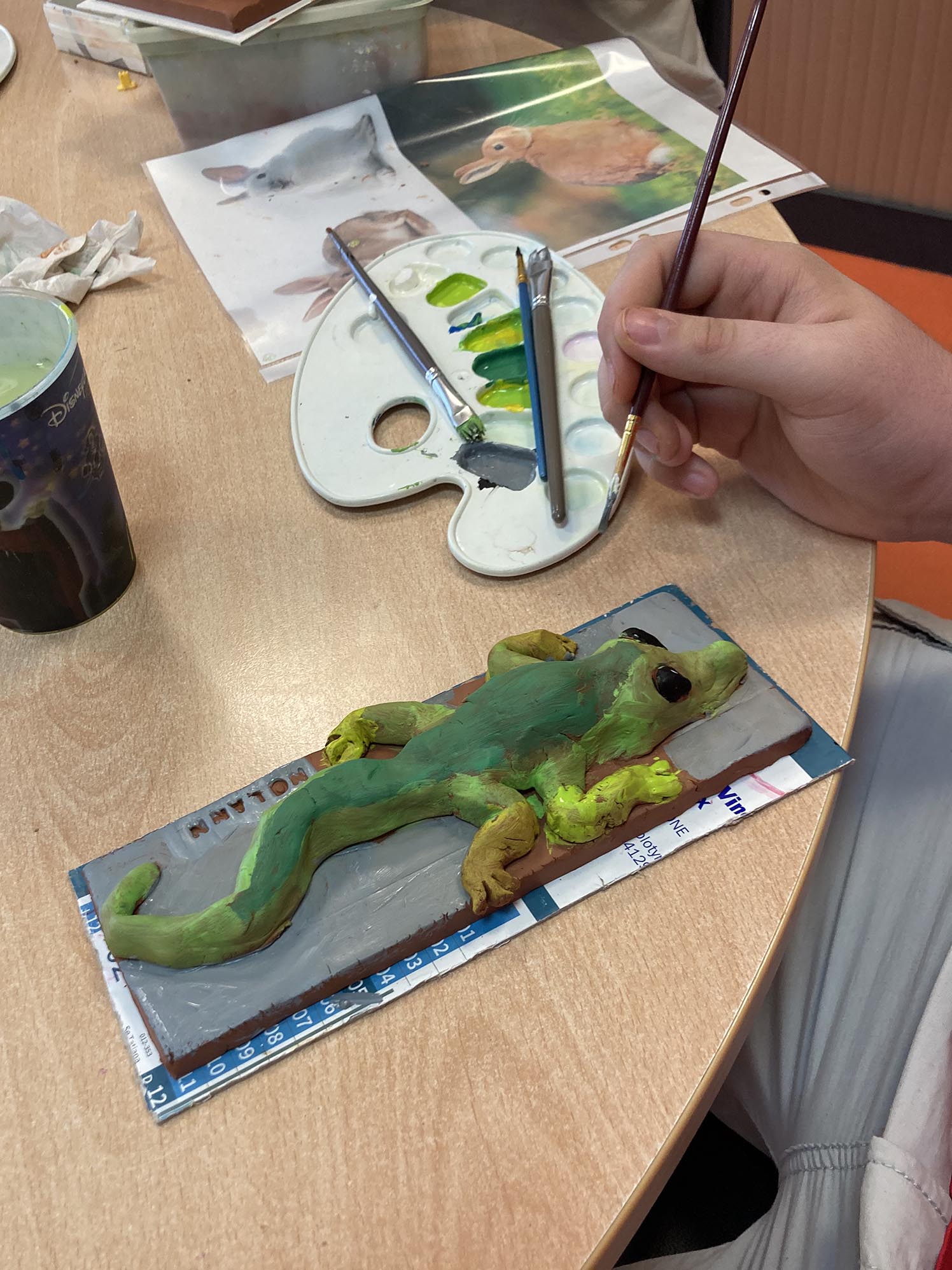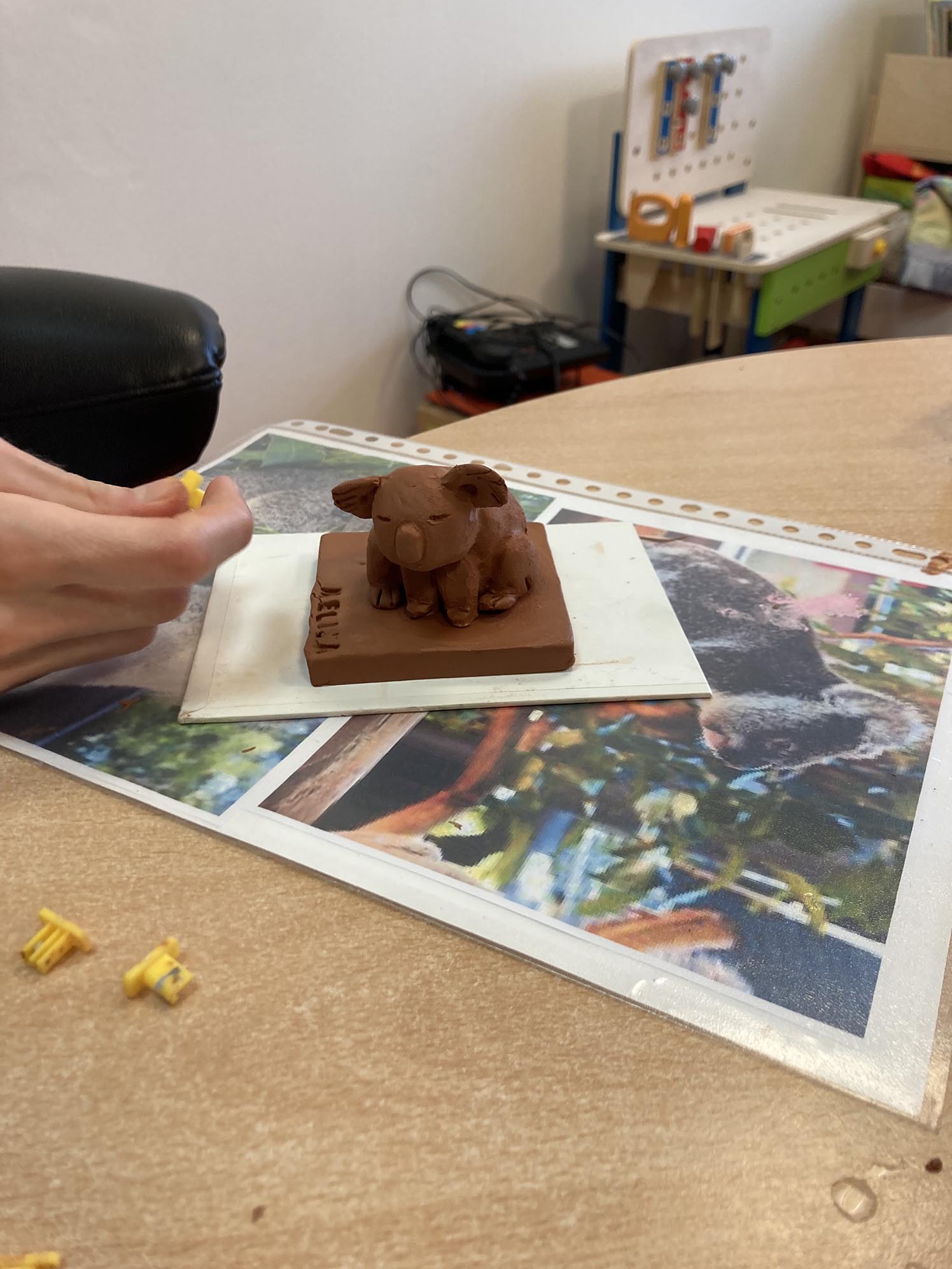 Nolan 15 ans, Améliya 15 ans, René-Lise 13 ans et Ninon 13 ans passent un moment avec moi dans la salle d’activité pour réaliser des figurines d’animaux en argile.