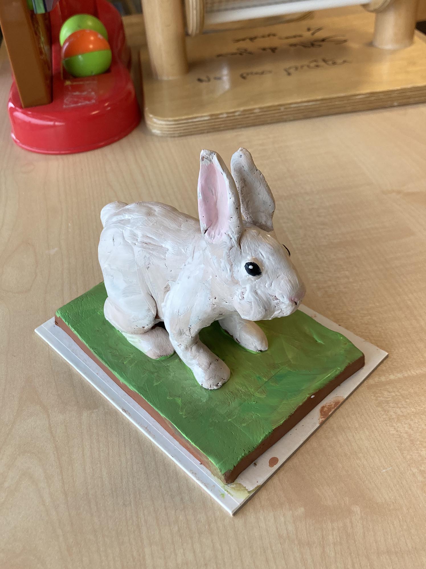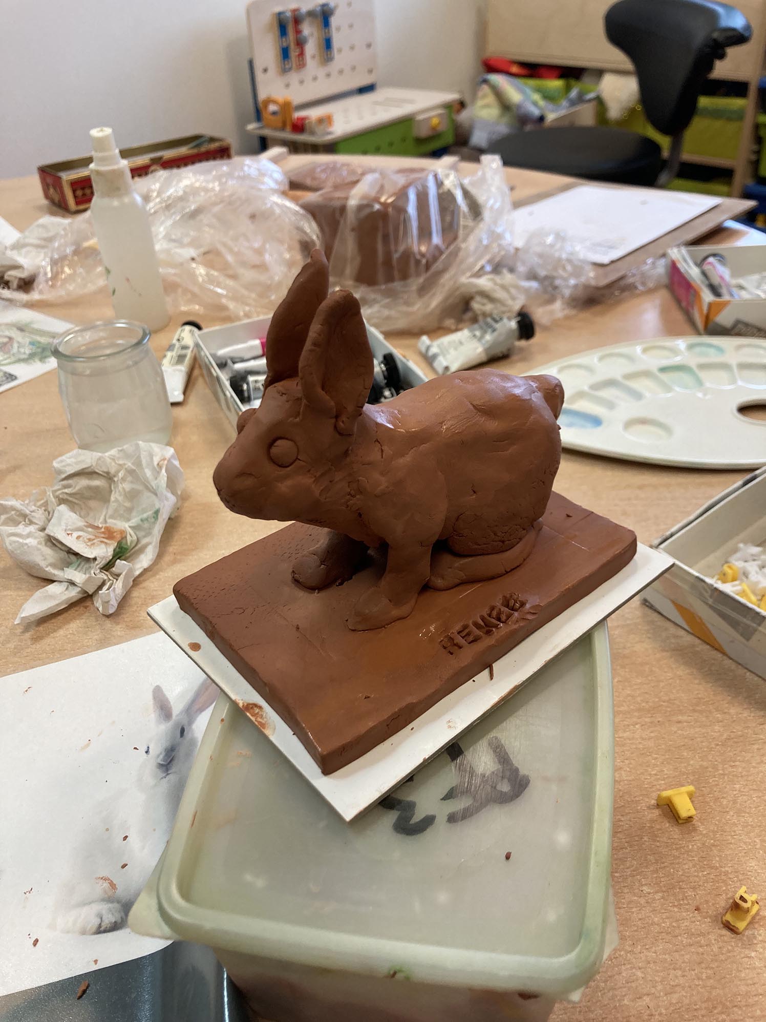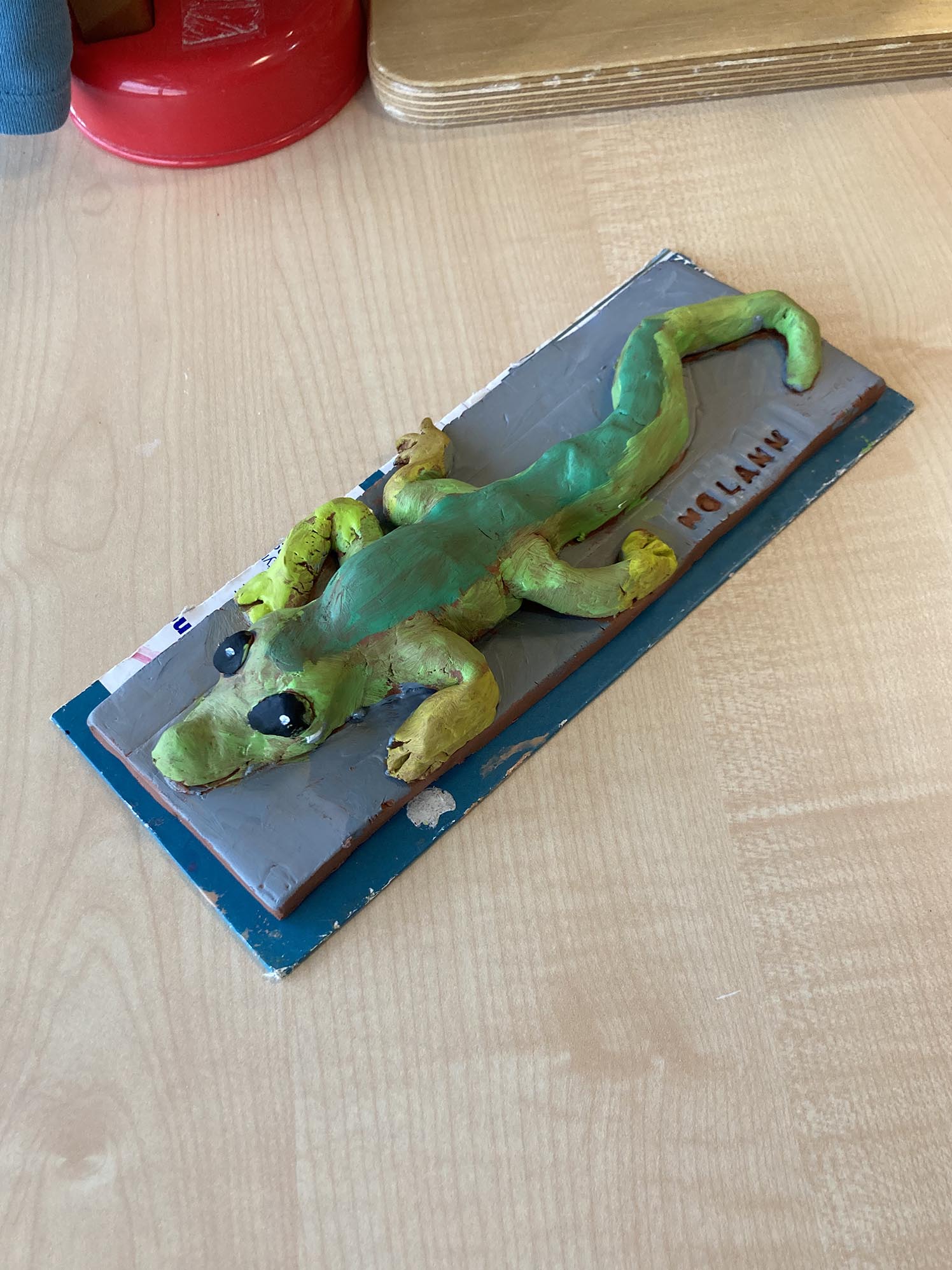 Nolan 15 ans, Améliya 15 ans, René-Lise 13 ans et Ninon 13 ans passent un moment avec moi dans la salle d’activité pour réaliser des figurines d’animaux en argile.