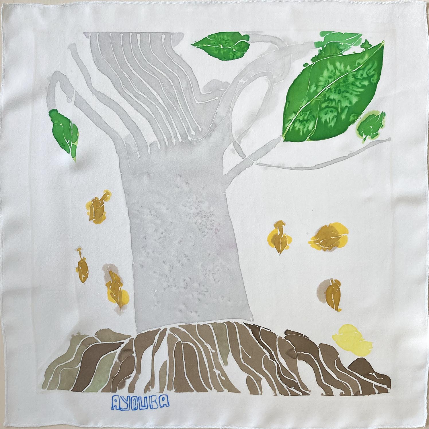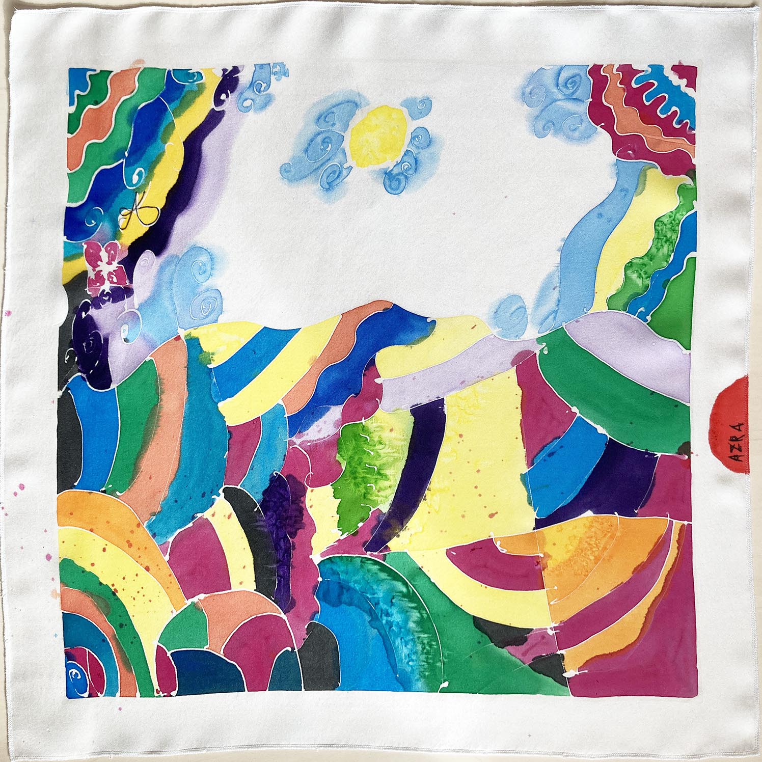 Célie 8 ans, Azna 13 ans, Ayouba 15 ans et Noursine 6 ans créent un décor peint sur un carré de soie blanche. Nous utilisons une peinture thermofixable qui, grâce à l’utilisation d’un fer à repasser, permet aux enfants d’emporter dès la fin de la séance leur foulard.