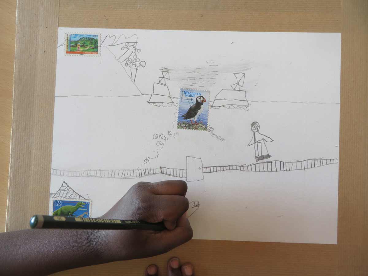Choisir trois timbres et les coller sur une feuille de papier. Dessiner autour en continuité de ce que représentent les timbres et inventer une histoire. La mise en couleur est faite à l’aquarelle.