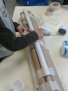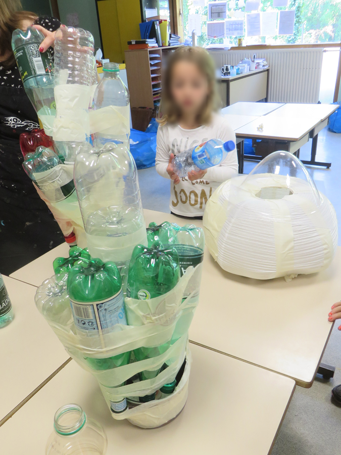 Pour fabriquer les arbres, nous avons récupéré des bouteilles en plastique, des rouleaux en carton, de la gaine, du tube en plastique que nous avons assemblés avec du ruban de masquage.