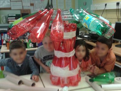 En mai 2016, avec les enfants de deux classes de CP de l’école élémentaire Jacques Fert à Reyrieux, nous avons réalisé des éléments de décors en objets de récupération et papier mâché pour le spectacle de fin d’année.