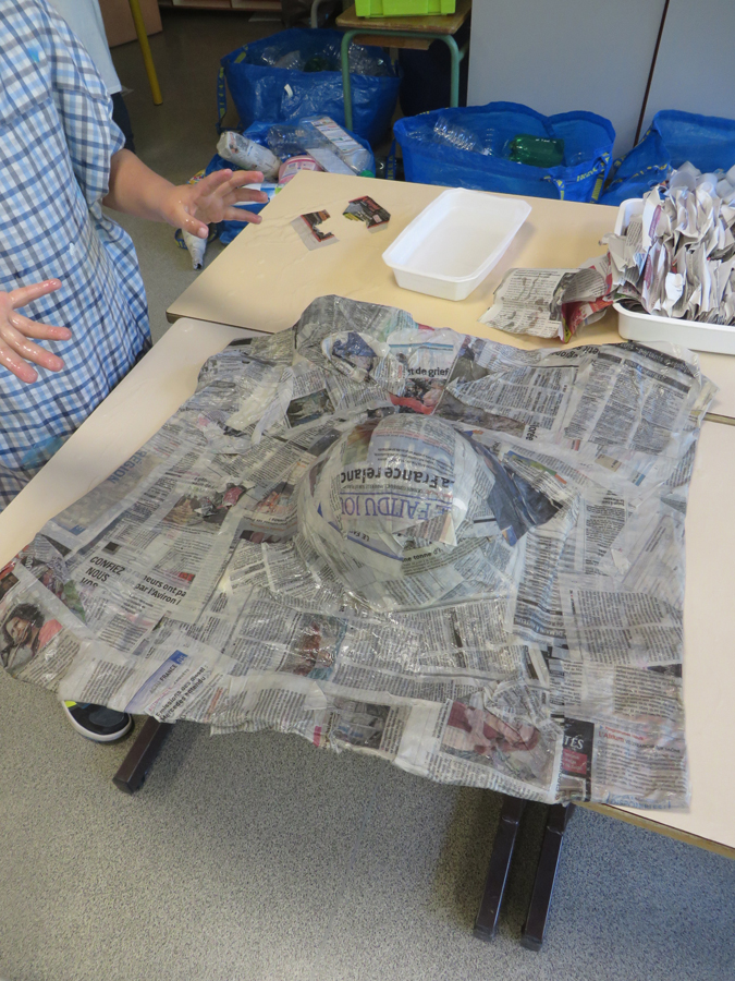 Pour réaliser les fruits, les enfants ont recouverts de papier journal des ballons de baudruche.