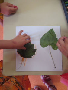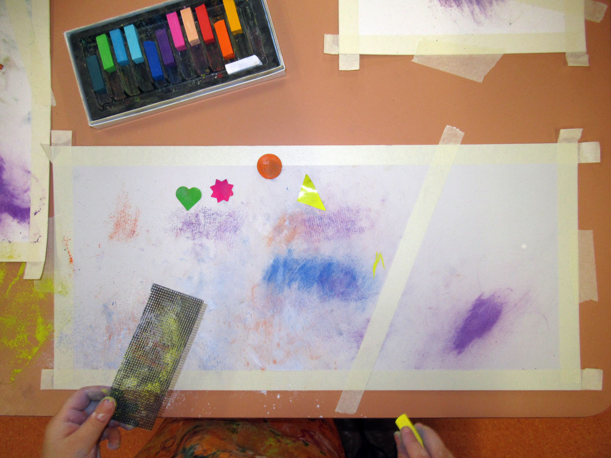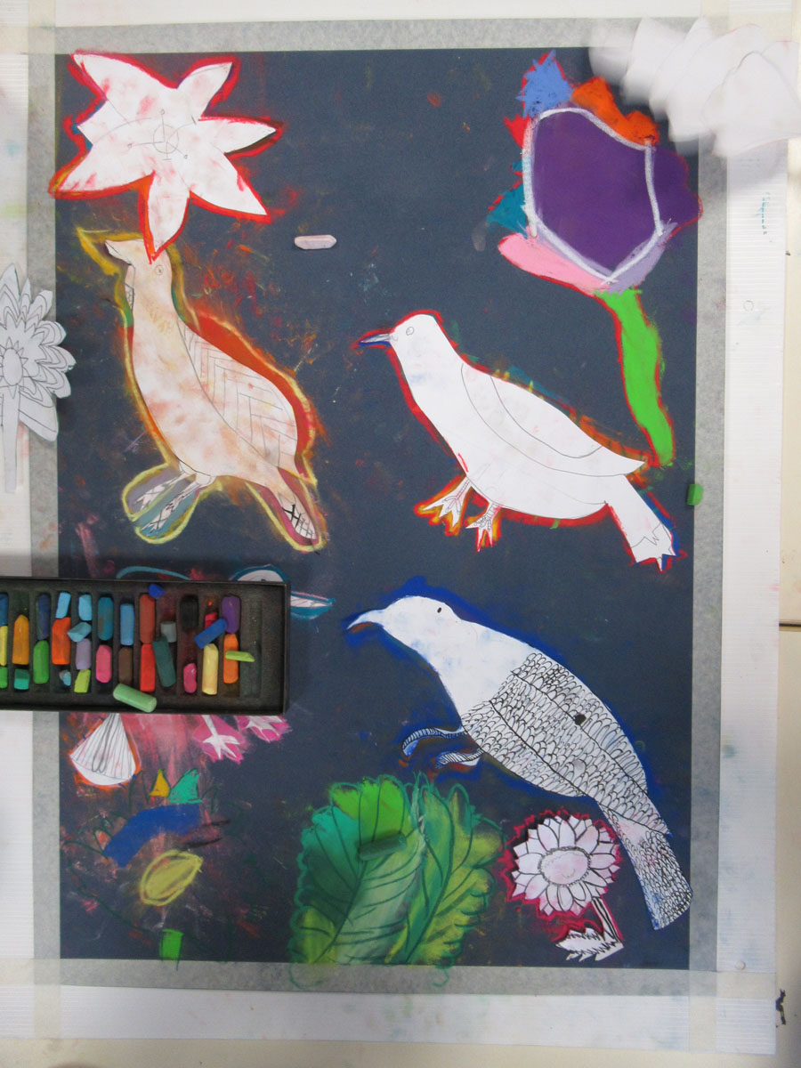 Peindre au pastel les feuilles qu’on vient de dessiner ainsi que le contour du tableau …