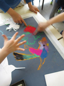 Voici un atelier de dessin au pastel sur le thème des couleurs dans la campagne, avec des enfants âgés de 3 à 5 ans inscrits au centre de loisir de Champagne au Mont d’or – Les chaudoudous – Juillet 2021.