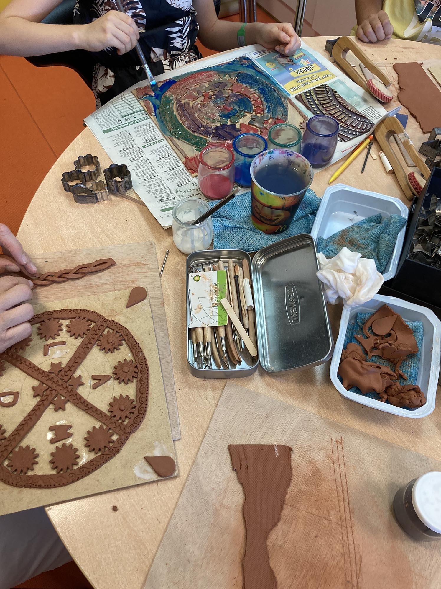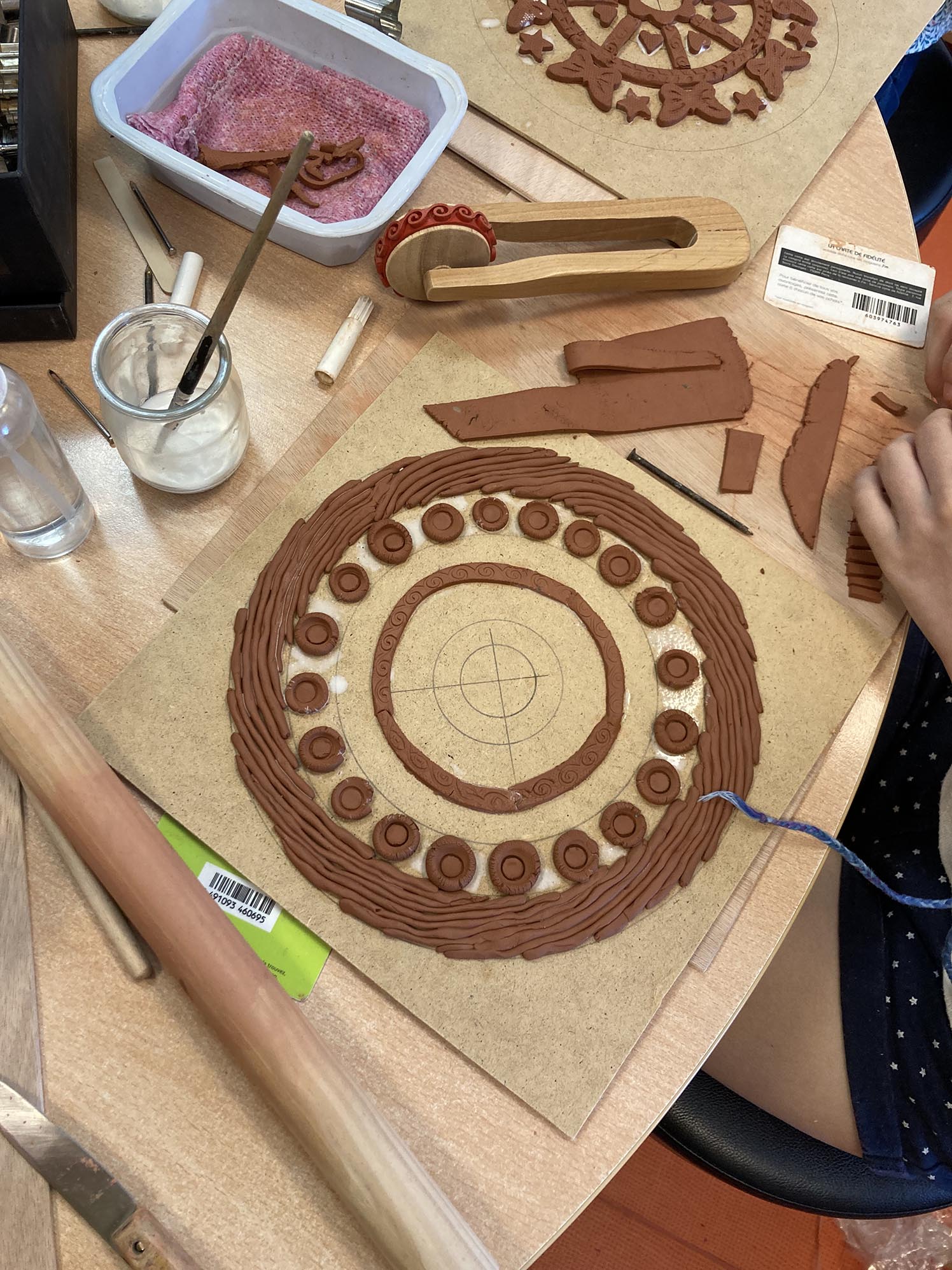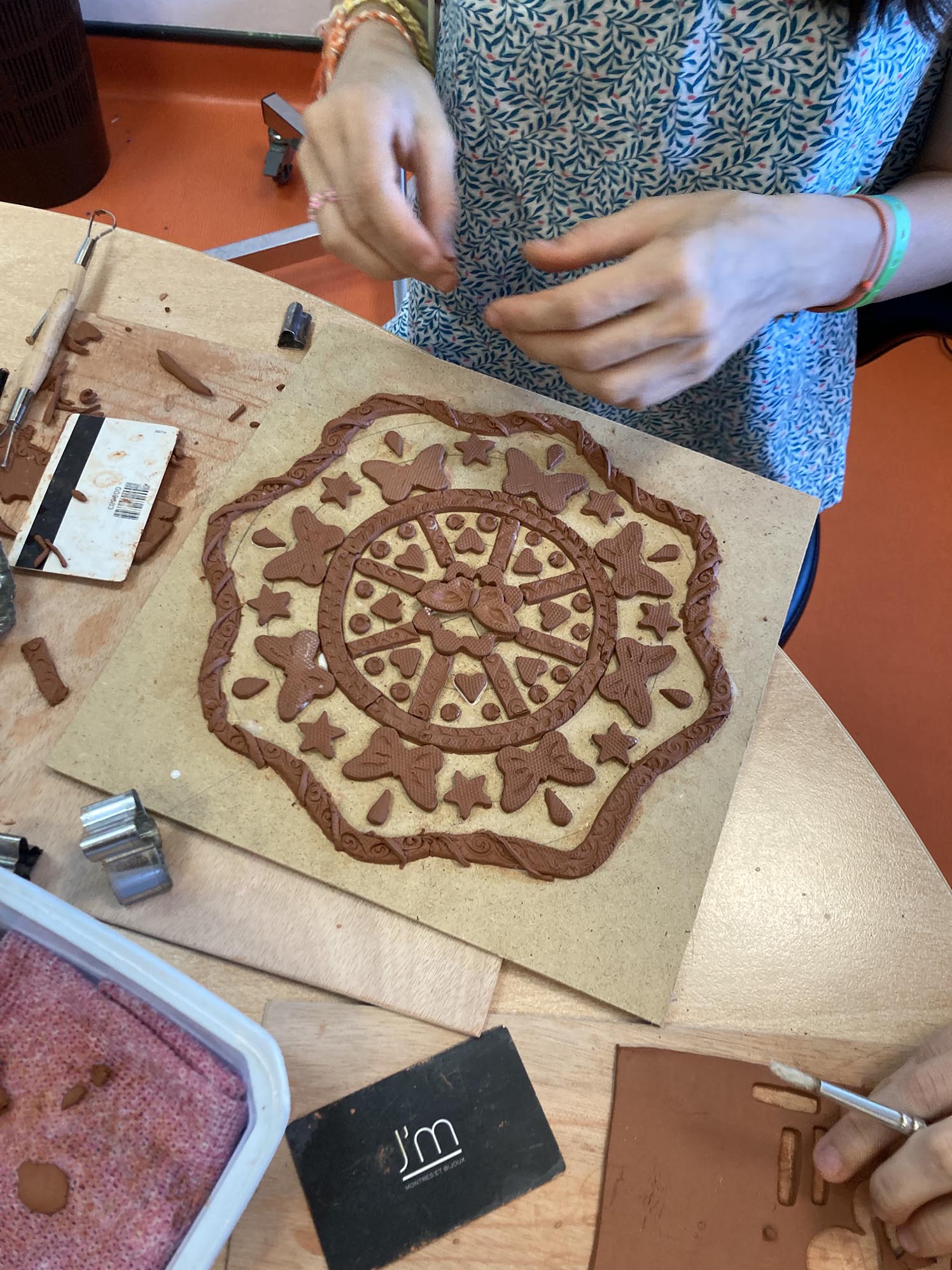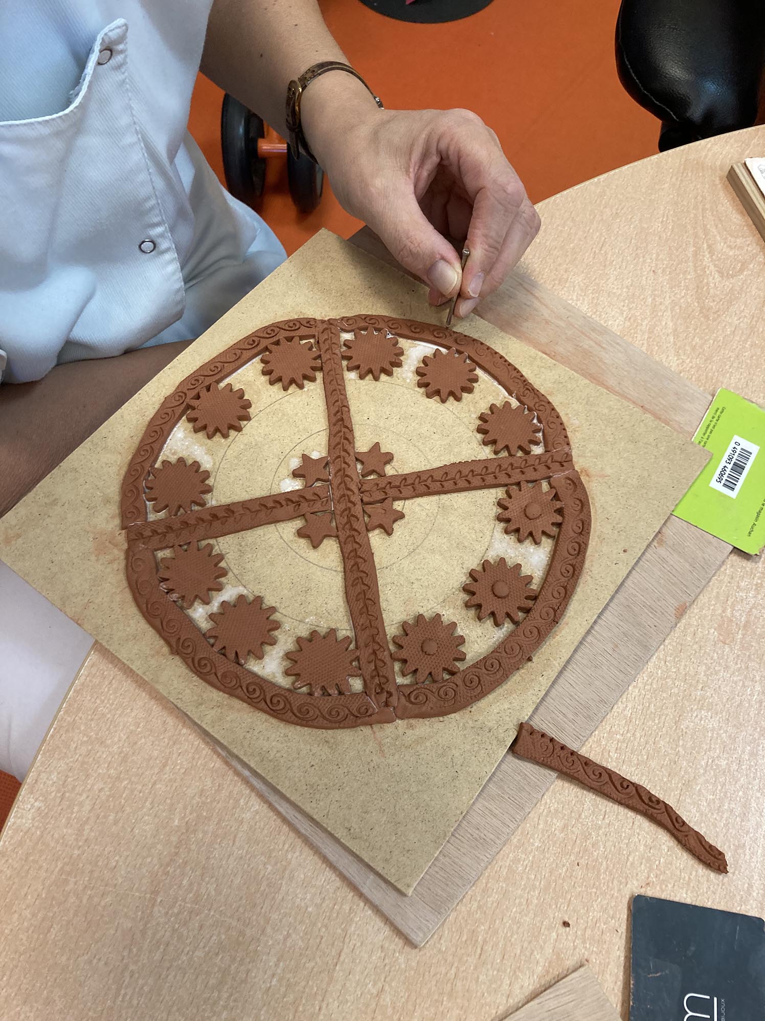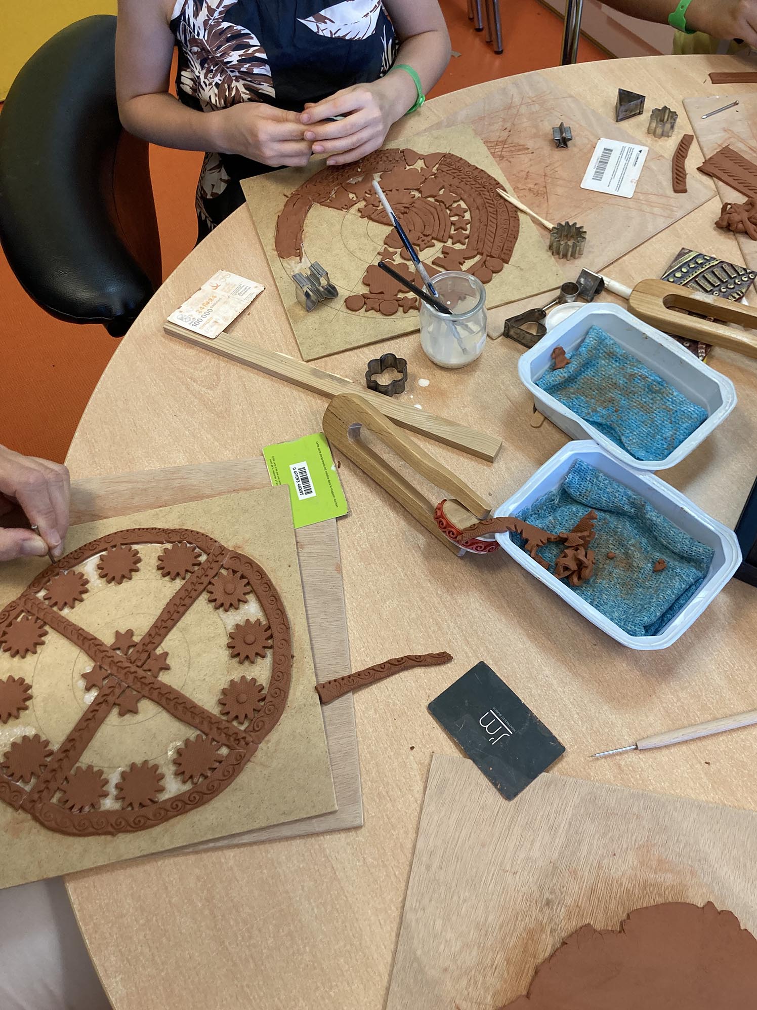 La troisième séance est consacrée au décor derrière les personnages. Celui-ci est créé en relief, en découpant, collant , gravant et superposant de fines plaques d’argile couvertes de colle blanche.