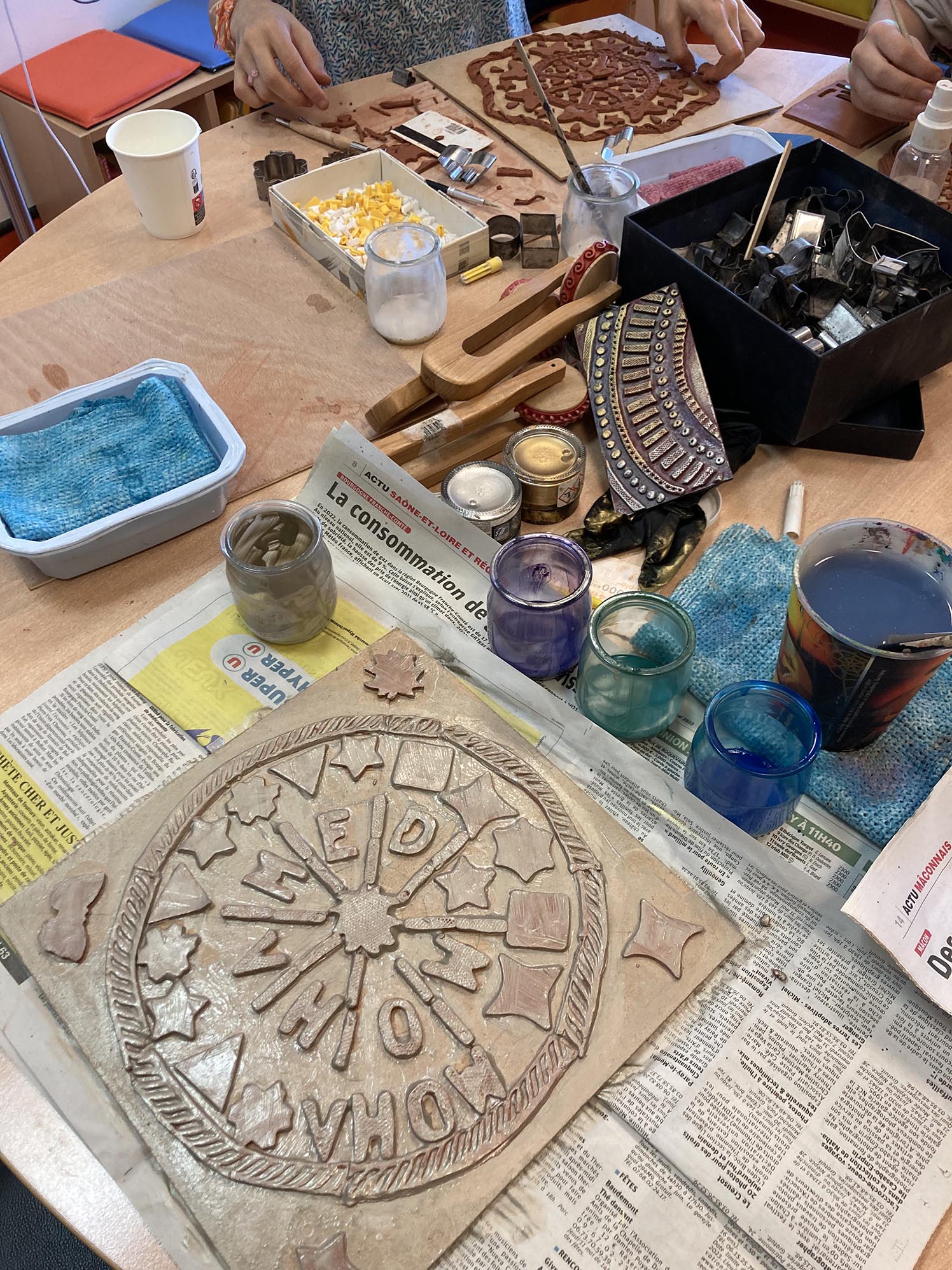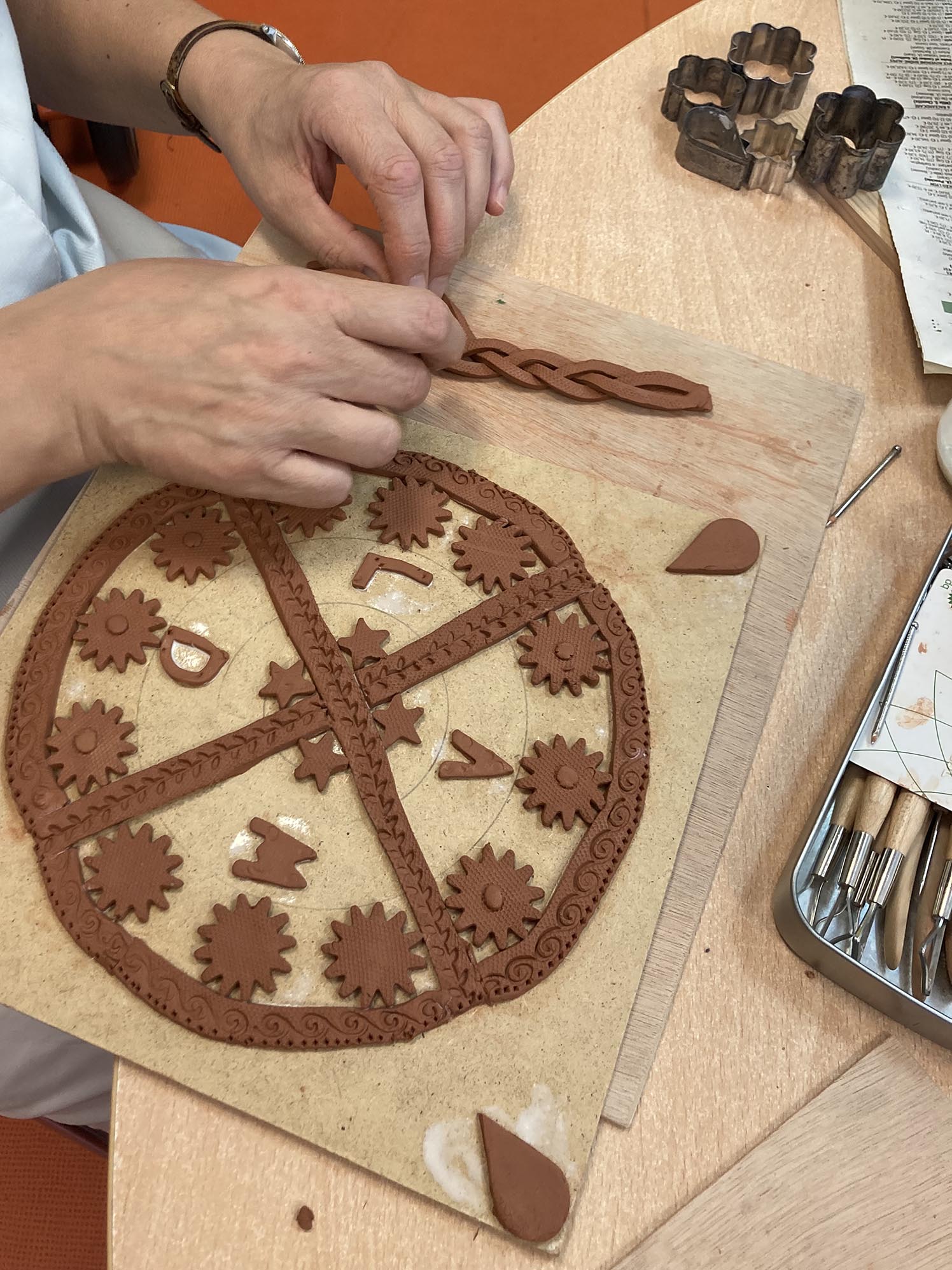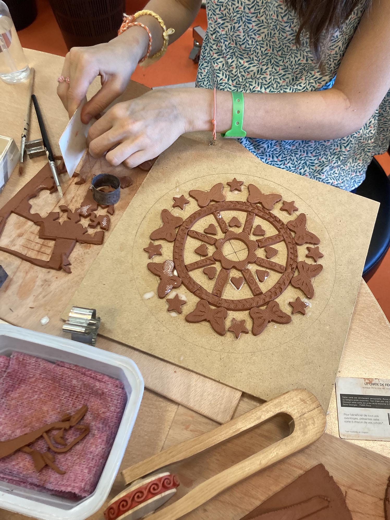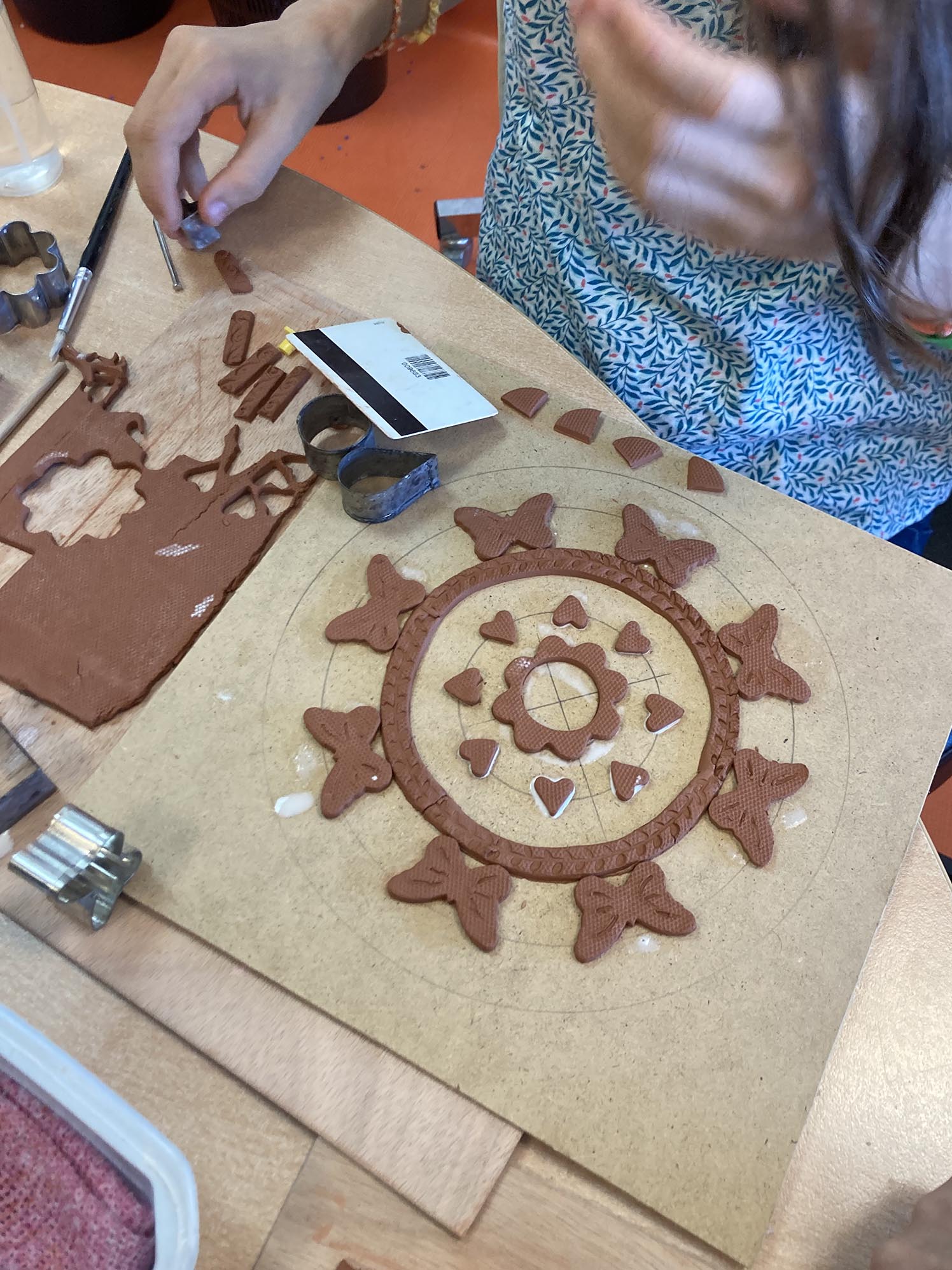 La troisième séance est consacrée au décor derrière les personnages. Celui-ci est créé en relief, en découpant, collant , gravant et superposant de fines plaques d’argile couvertes de colle blanche.