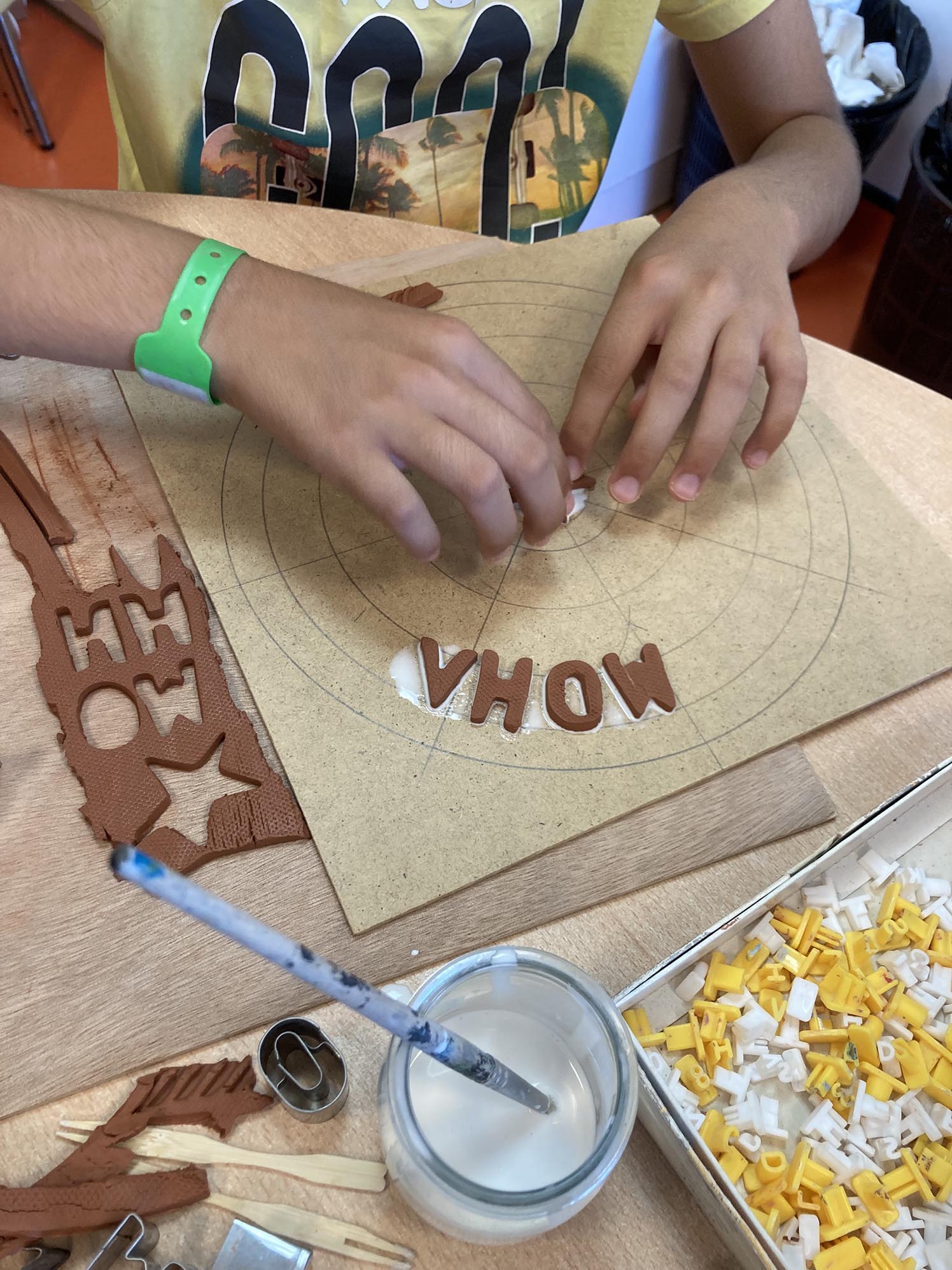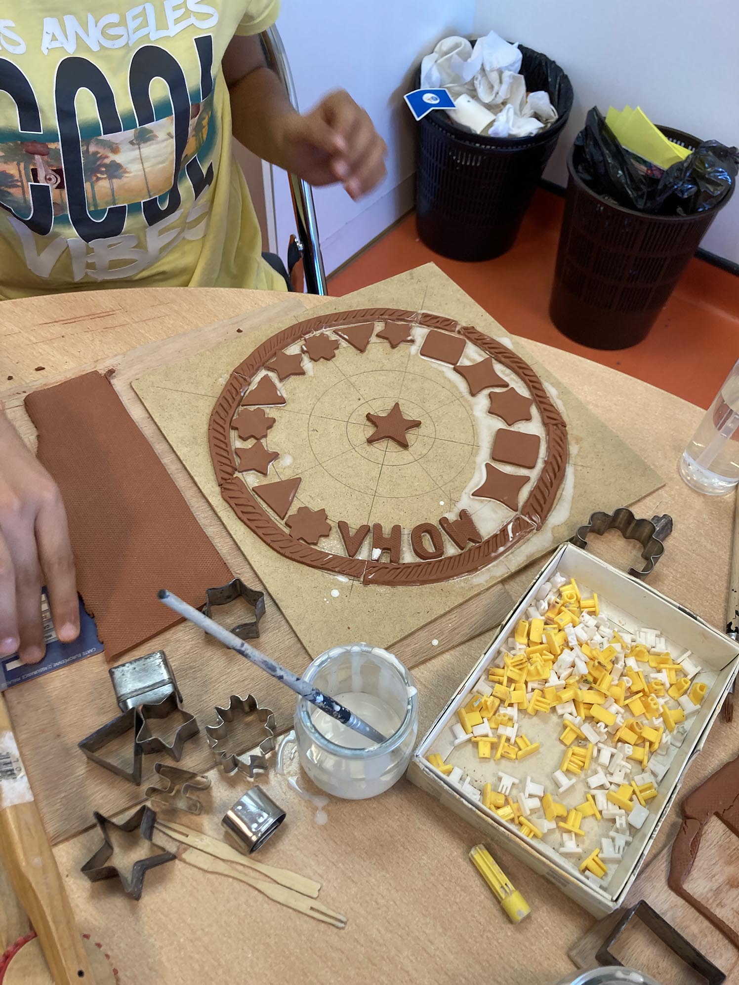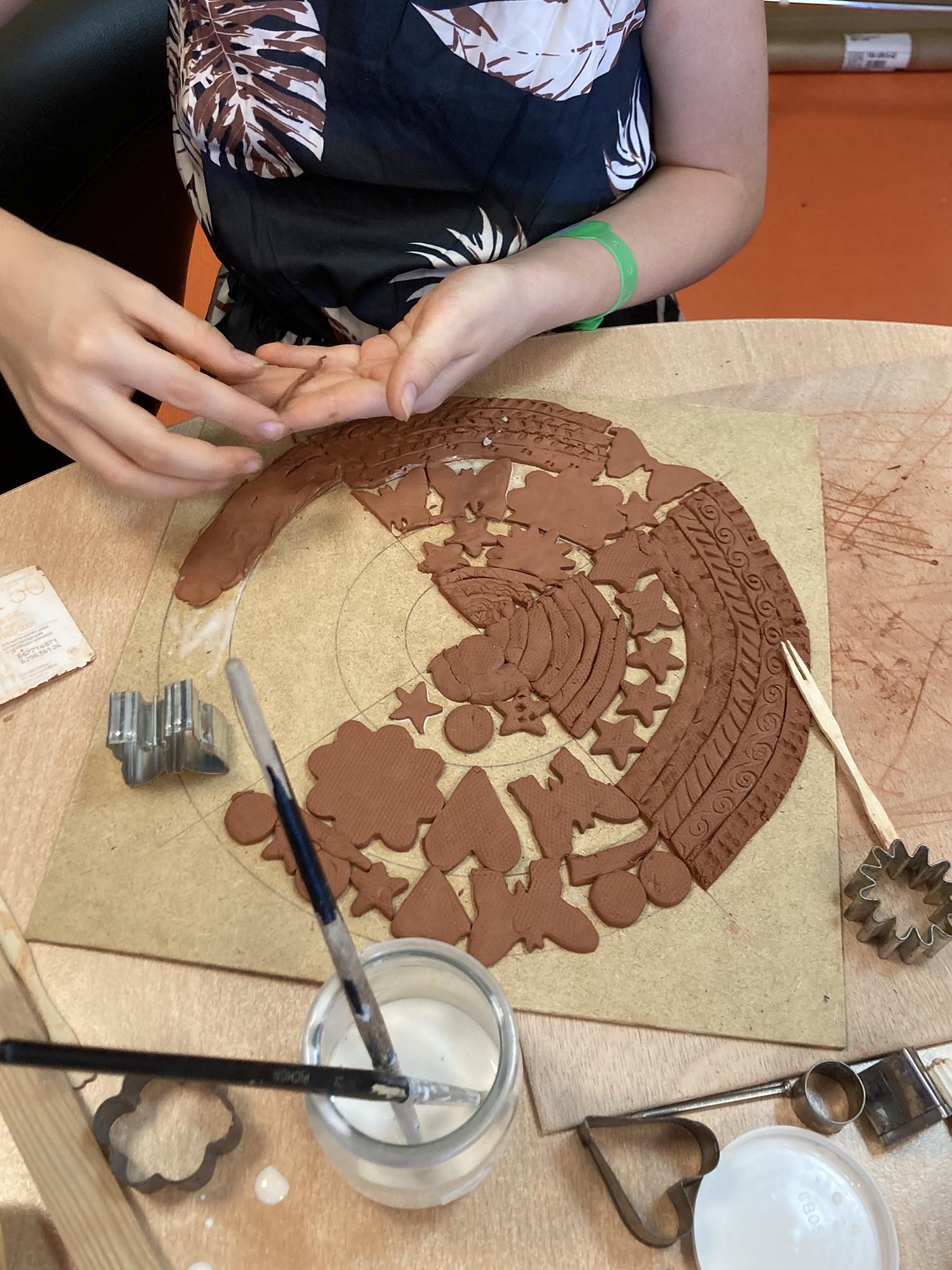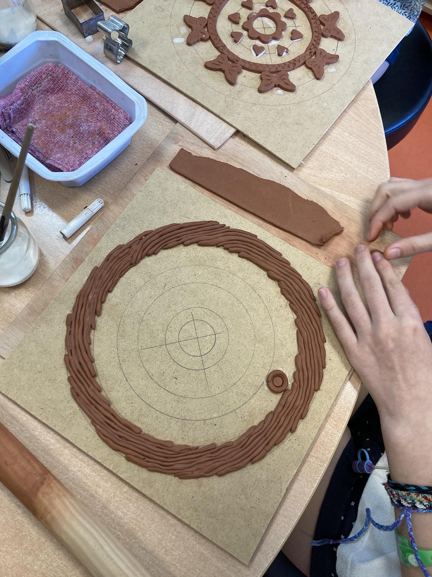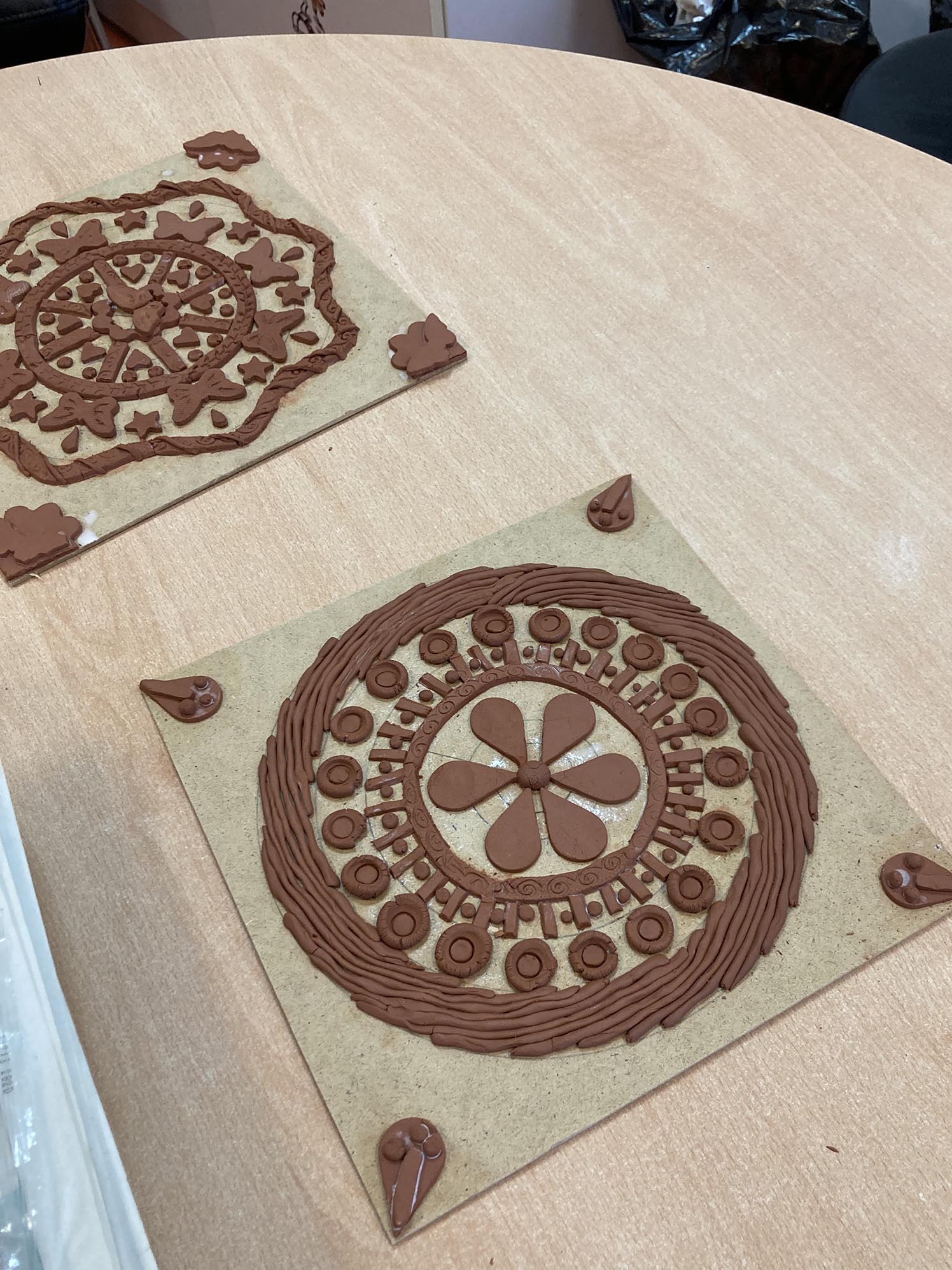 La troisième séance est consacrée au décor derrière les personnages. Celui-ci est créé en relief, en découpant, collant , gravant et superposant de fines plaques d’argile couvertes de colle blanche.