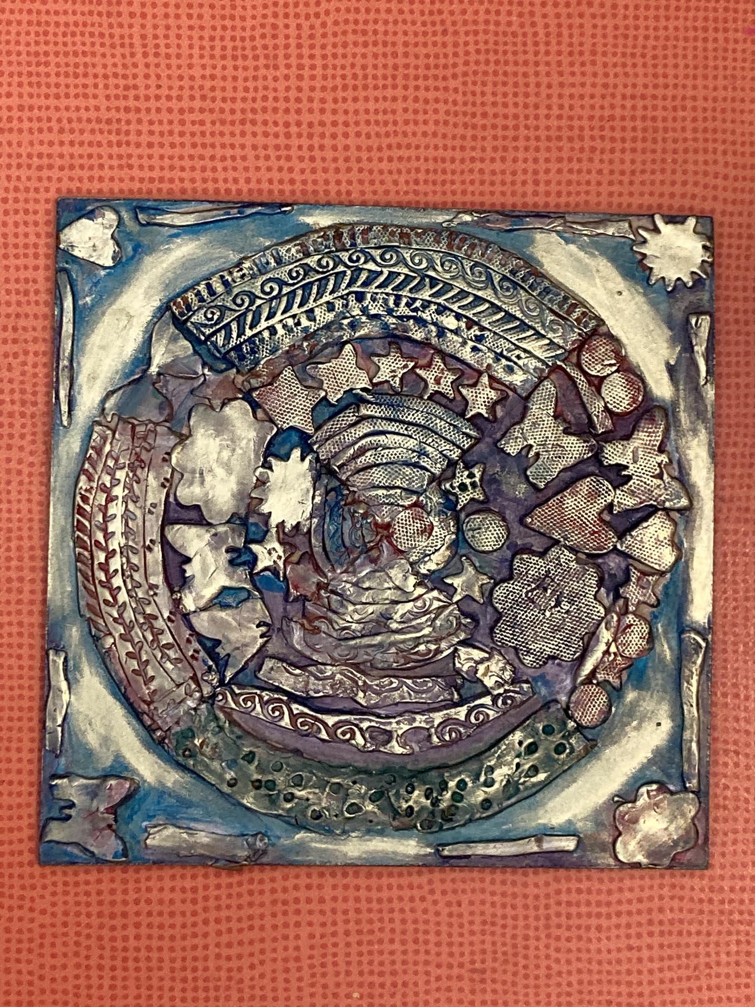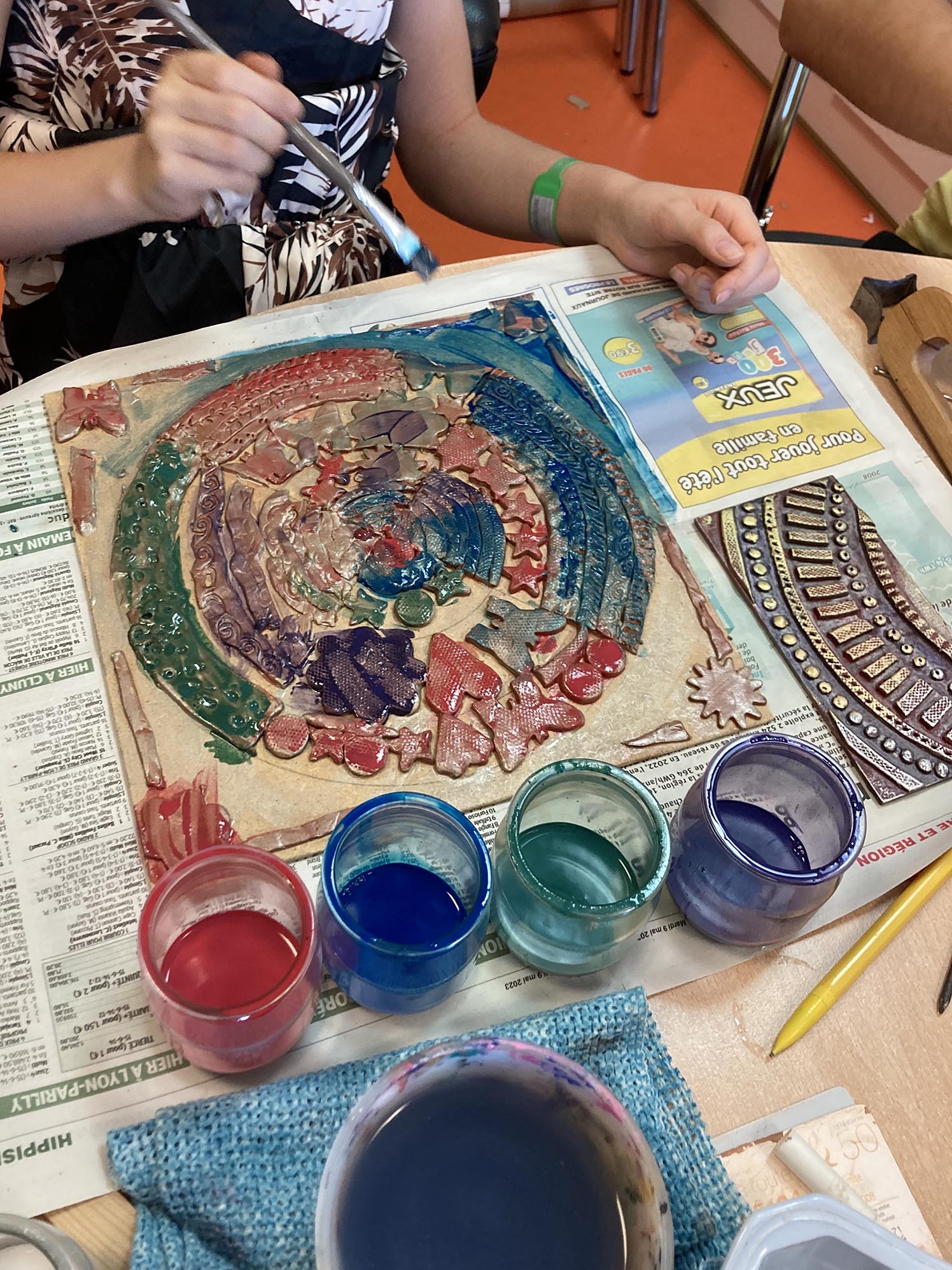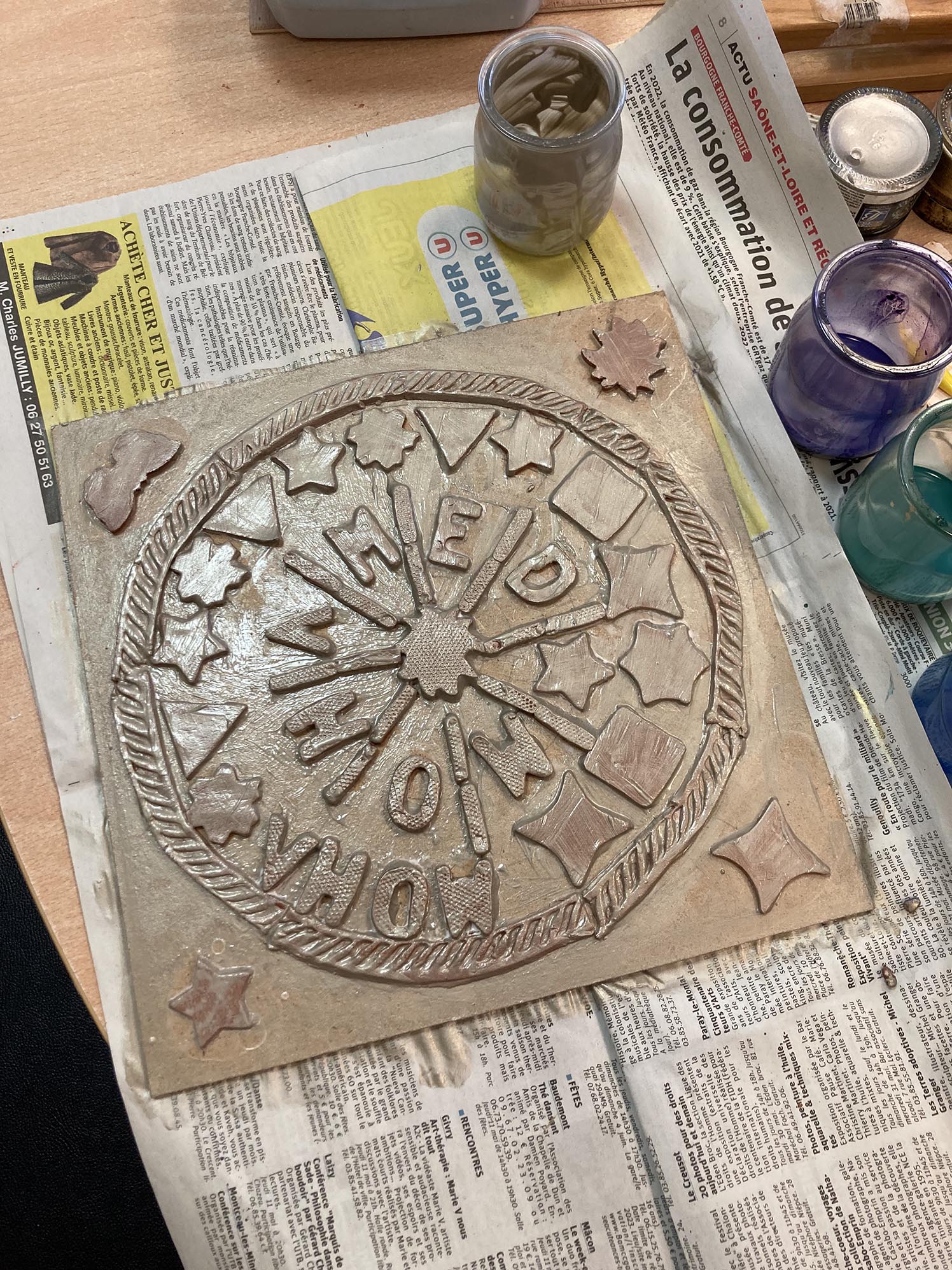 La dernière séance est consacrée à la peinture des hauts-reliefs. Pour uniformiser l’ensemble et donner l’illusion que le tableau est en métal, l’ensemble est couvert d’une couche d’acrylique couleur étain.