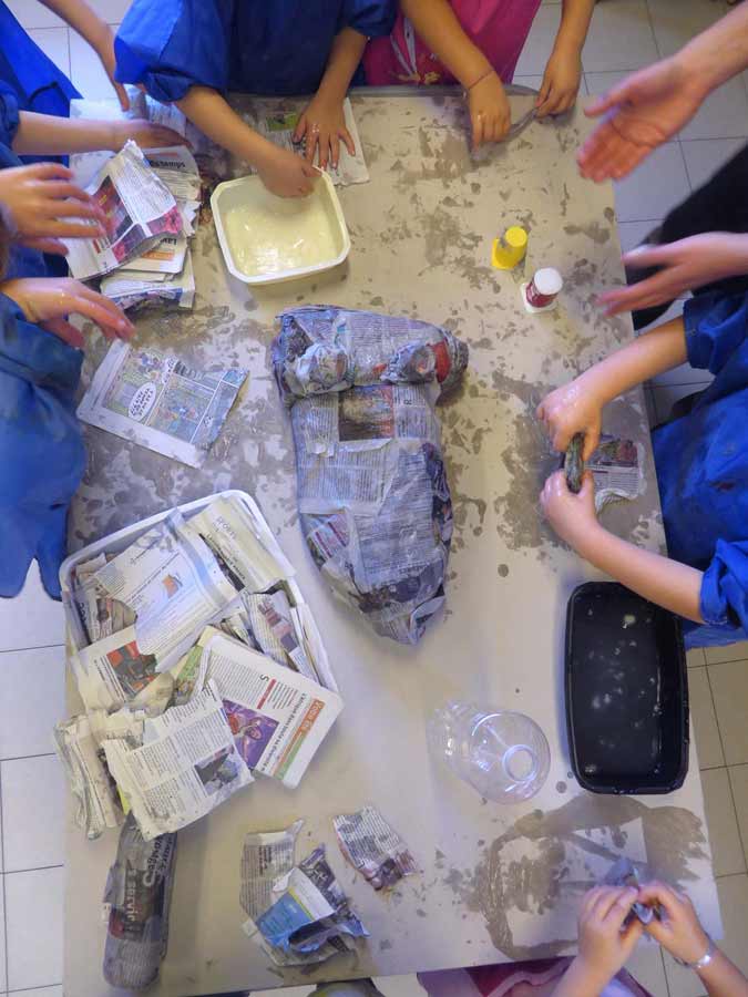 En classe de moyenne et grande section, les enfants étudient le schéma corporel et apprennent à nommer chaque partie du corps. Grâce à ce travail collectif de sculpture, les enfants ont appris à identifier de nouveau chaque partie du corps de façon ludique.