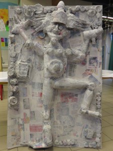 Après séchage du papier mâché, une couche de peinture acrylique blanche a permis de rendre plus lisibles les volumes et le tableau dans son ensemble.