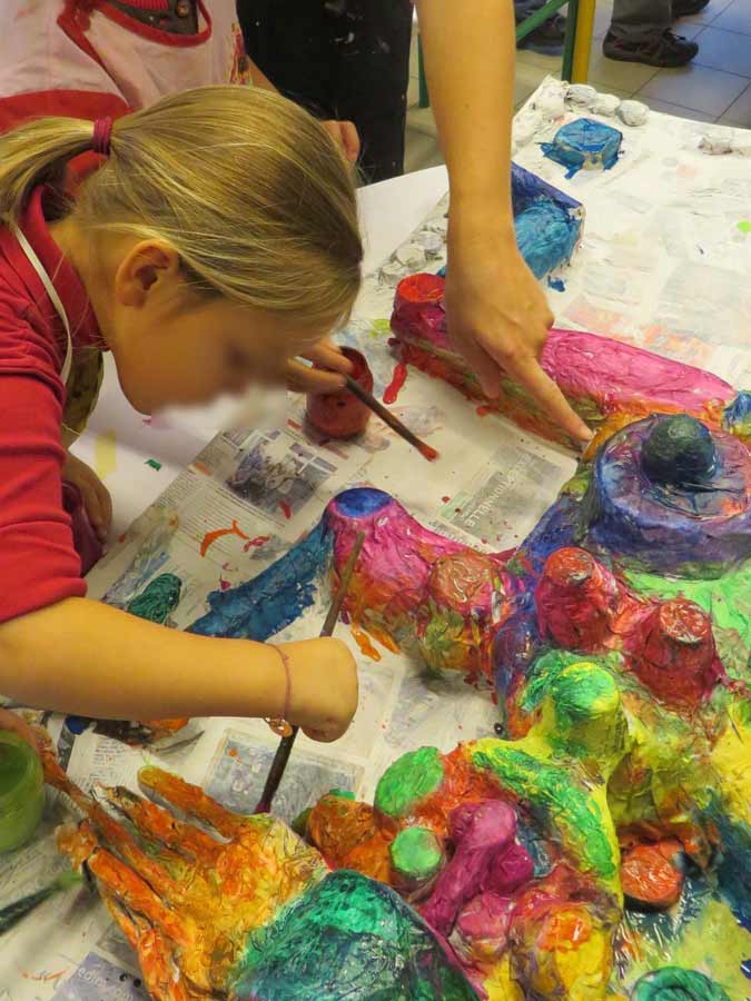 Lors d’une troisième séance, les enfants ont peint leur tableau avec des encres acryliques qui, en plus d’être lumineuses, offrent l’avantage de consolider les assemblages. Les reliefs ont été mis en valeur par l’application d’une cire dorée.